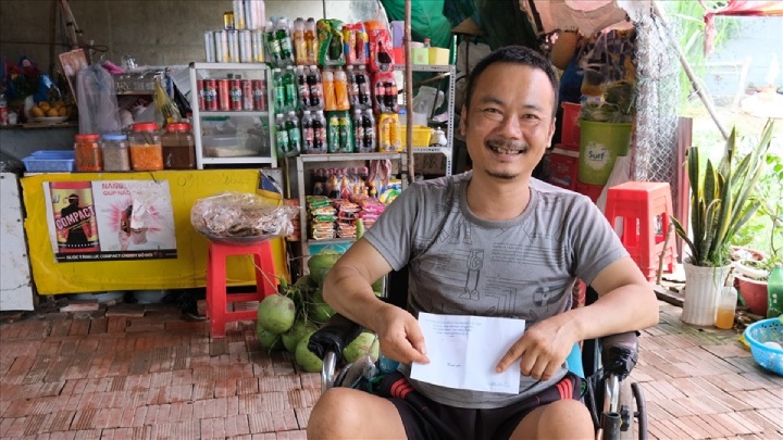 Trên chiếc xe lăn, hằng ngày, anh vẫn làm những công việc lặt vặt để phụ vợ buôn bán tạp hóa. Anh Dũng chia sẻ: "Tôi cảm động khi thấy Công đoàn đến tận nhà thăm hỏi. Hỗ trợ từ Công đoàn giúp tôi có thêm động lực, cùng vợ chăm sóc các con".