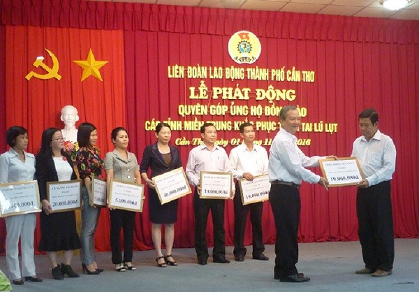 13h30 ngày 01/11/2016, Ban Thường vụ Liên đoàn Lao động thành phố Cần Thơ đã tổ chức thực hiện Lời kêu gọi của Đoàn Chủ tịch Tổng Liên đoàn Lao động Việt Nam về ủng hộ đồng bào các tỉnh miền Trung khắc phục thiên tai lũ lụt. Do ảnh hưởng của áp thấp nhiệt đới trên biển Đông, từ ngày 13/10 mưa lũ đã làm cho các tỉnh Nghệ An, Hà Tĩnh, Quảng Bình, Quảng Trị ngập trong biển nước, giao thông bị tê liệt ở nhiều nơi, gần 100 nghìn ngôi nhà bị nhấn chìm. Nhiều gia súc, tài sản và hàng trăm nghìn hecta hoa màu, cây công nghiệp của người dân bị cuốn trôi…