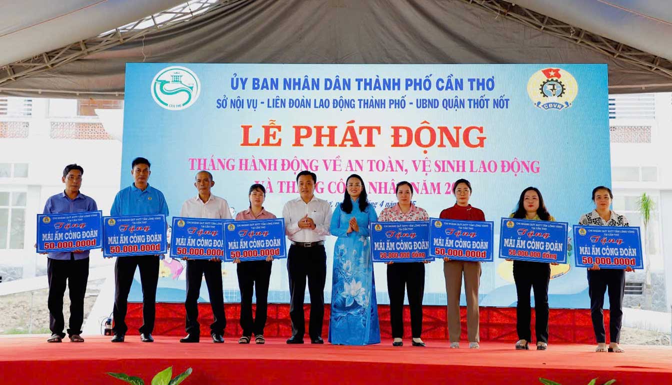 Trao Mái ấm Công đoàn cho đoàn viên tại lễ phát động Tháng Công nhân và Tháng Hành động về ATVSLĐ. Ảnh: LĐLĐ TP Cần Thơ