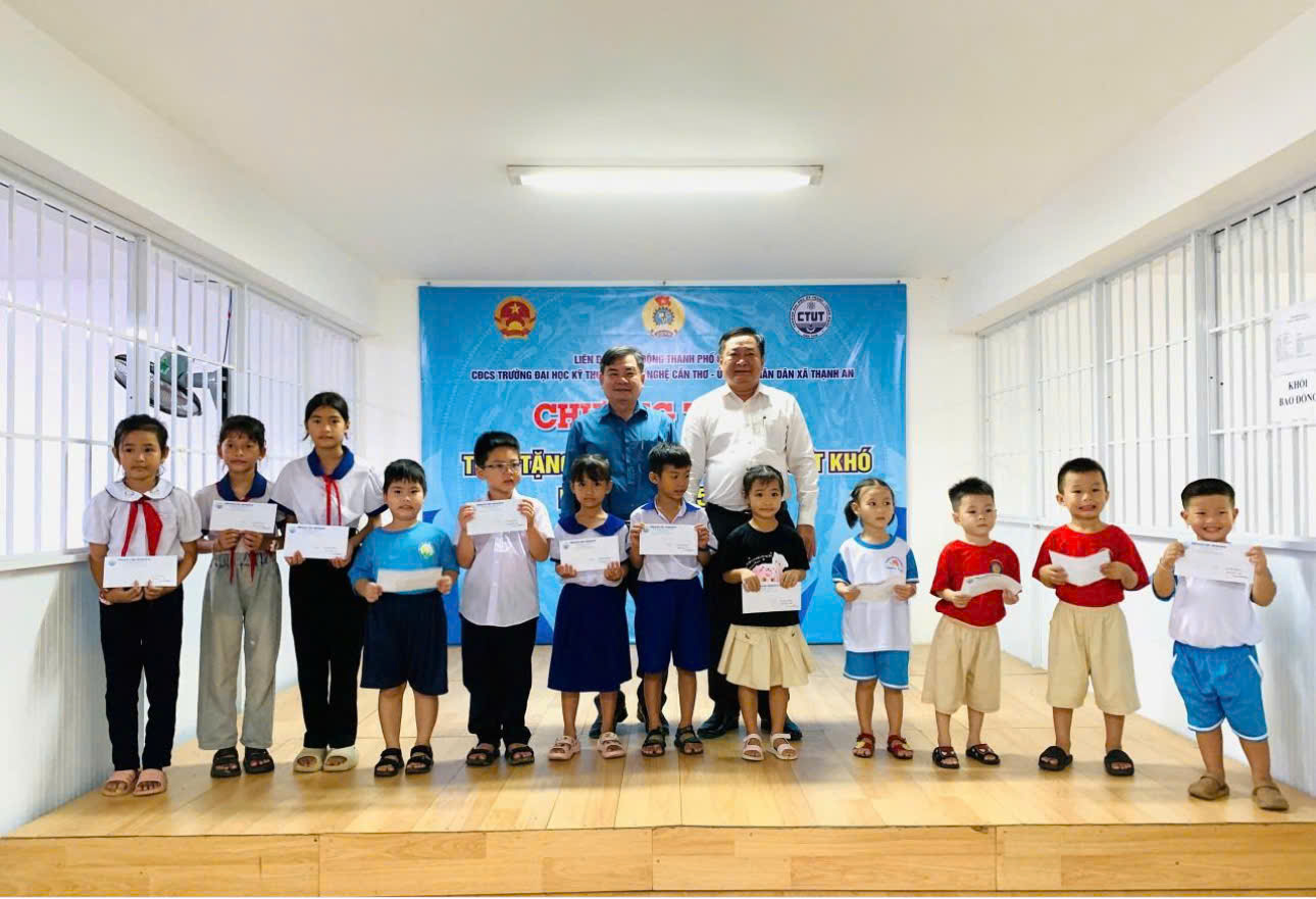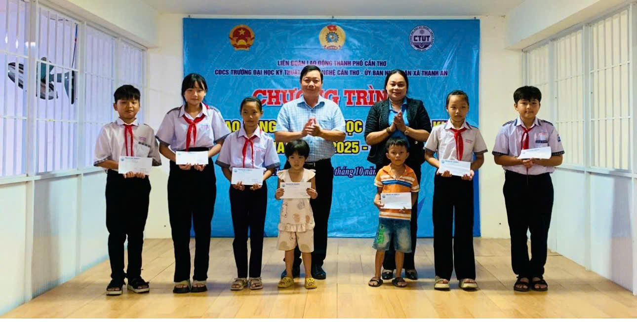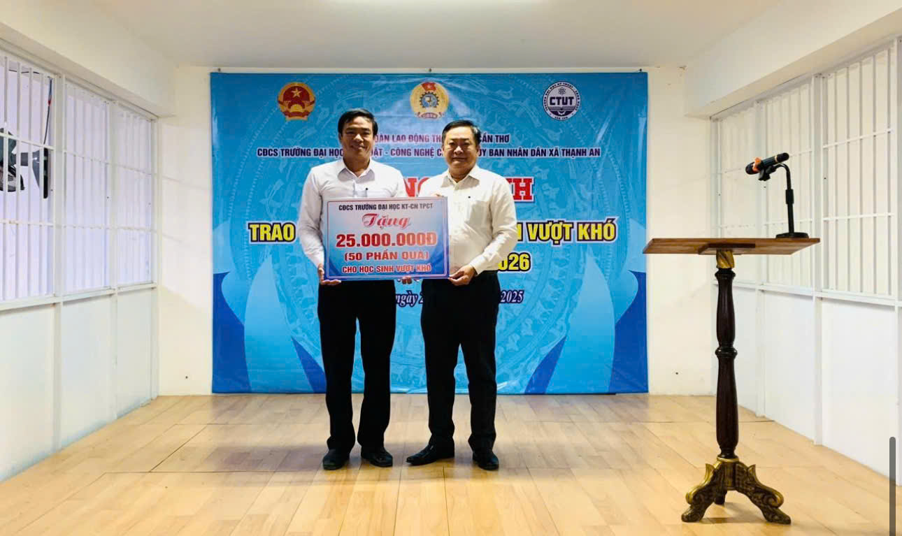 Sáng ngày 22/10/2025, đại diện của Trường Đại học Kỹ thuật – Công nghệ Cần Thơ gồm: Nhà giáo nhân dân, Phó giáo sư - Tiến sĩ Huỳnh Thanh Nhã, Hiệu trưởng; TS Nguyễn Minh Tuấn, Chủ tịch Hội Khuyến học, Trưởng phòng Quản lý đào tạo; ThS Lưu Thu Thủy, Chủ tịch Công đoàn, Trưởng khoa, Khoa học xã hội đã trao tặng 50 phần quà trị giá 25 triệu đồng cho 50 học sinh có hoàn cảnh khó khăn, phấn đấu vươn lên học tốt năm học 2025-2026 của Xã Thạnh An, thành phố Cần Thơ.