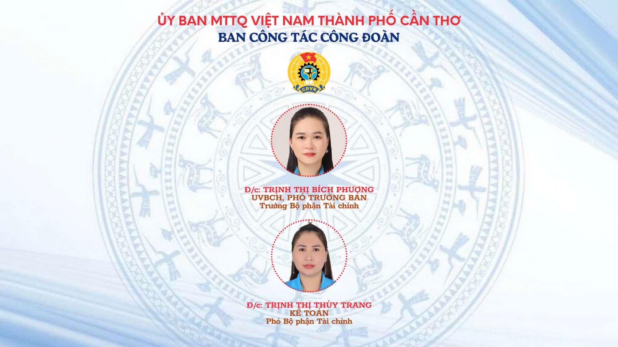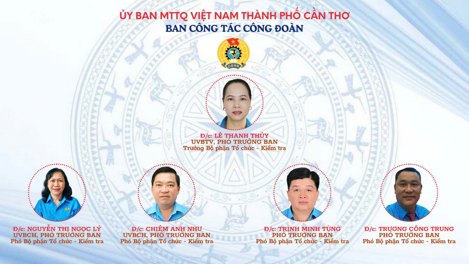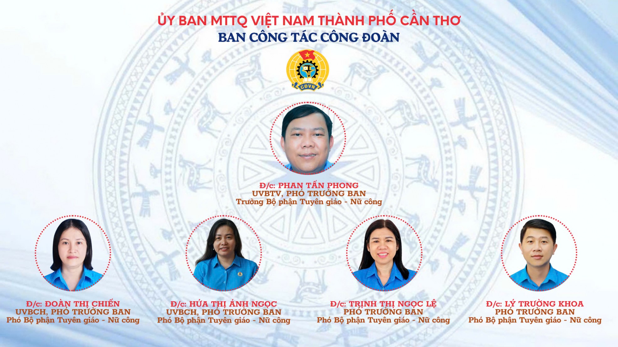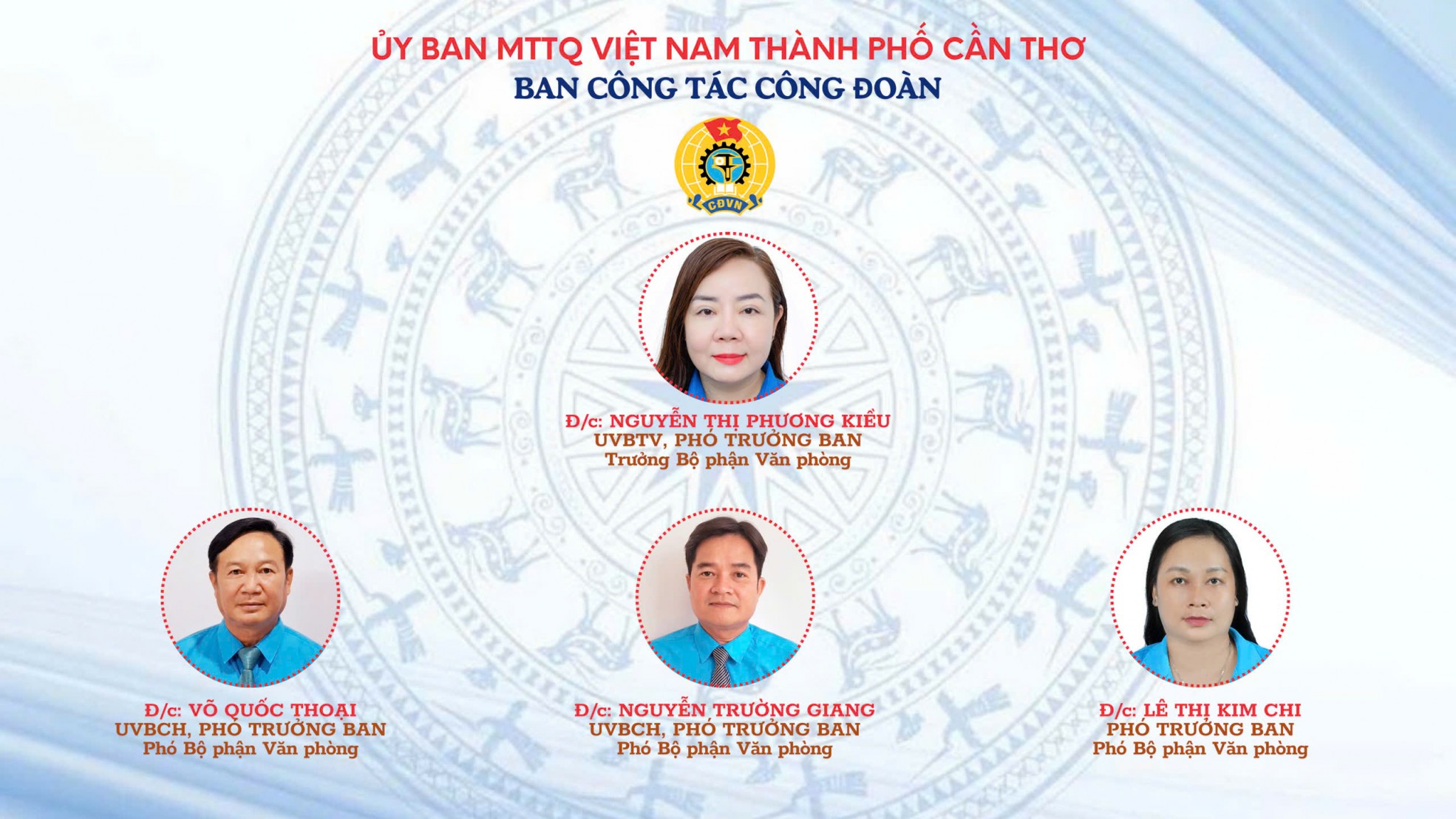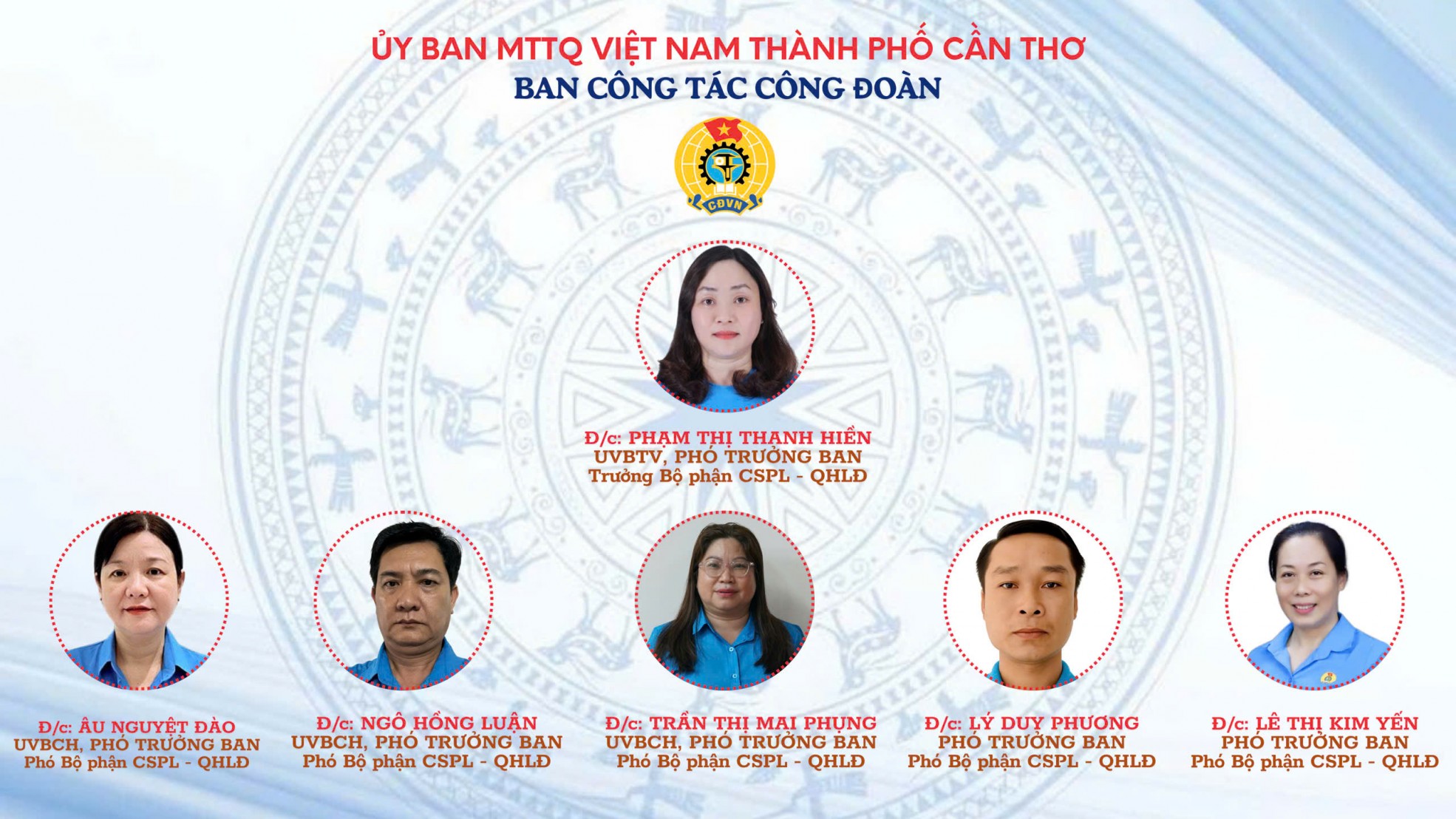 Dưới đây là thông tin Lãnh đạo LĐLĐ TP Cần Thơ và Ban Công tác Công đoàn thuộc Ủy ban Mặt trận Tổ quốc Việt Nam TP Cần Thơ.