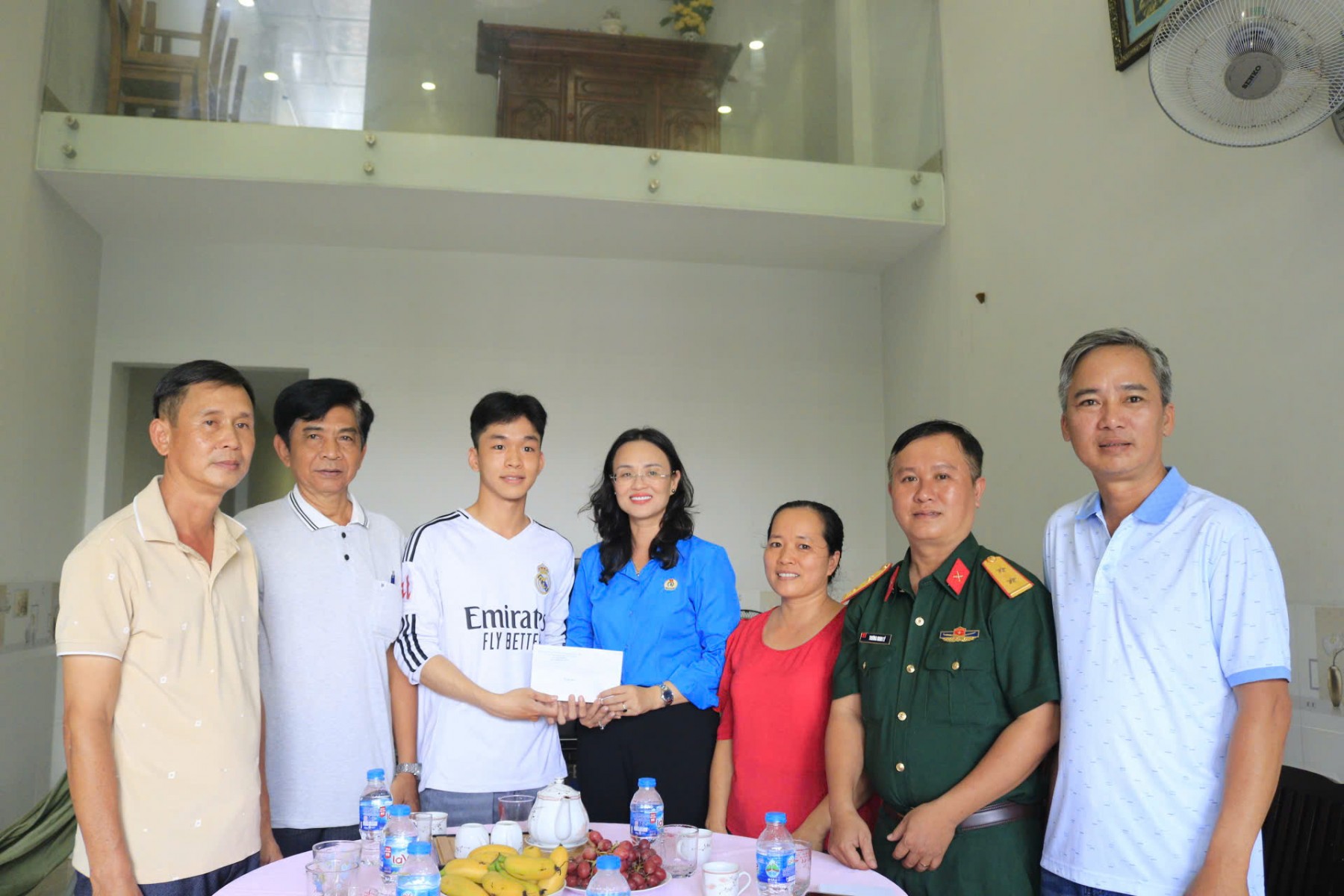 Chủ tịch LĐLĐ TP Cần Thơ Lê Thị Sương Mai thăm, động viên thanh niên chuẩn bị lên đường nhập ngũ tại phường Bình Thủy. Ảnh: LĐLĐ TP Cần Thơ