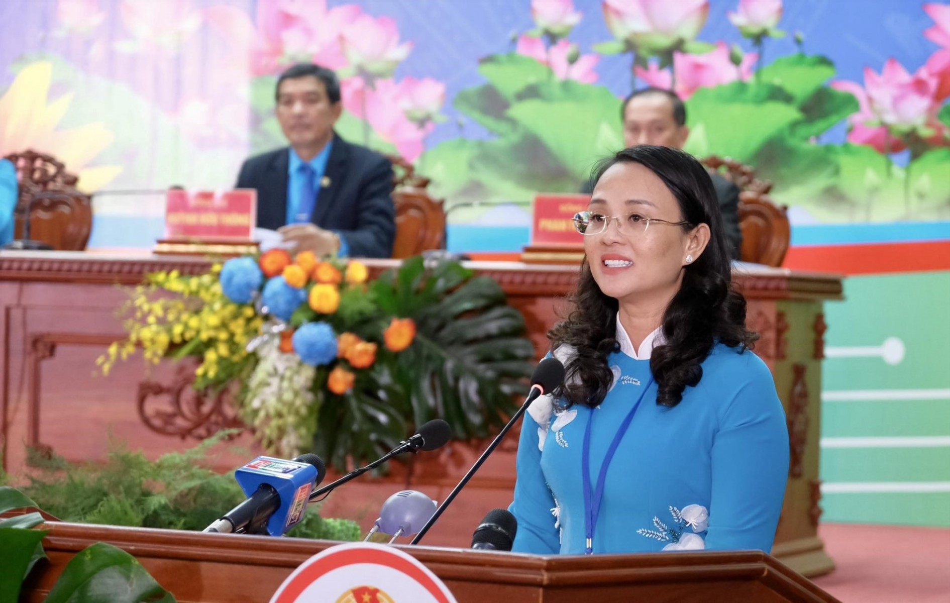 Chủ tịch LĐLĐ TP Cần Thơ Lê Thị Sương Mai đọc diễn văn khai mạc đại hội. Ảnh: Phong Linh