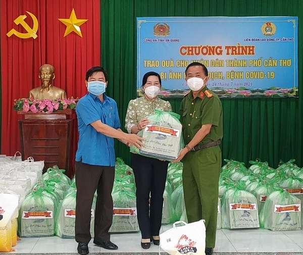 Sáng ngày 24/7/2021, Đoàn trao quà nhu yếu phẩm thiết yếu do bà Lê Thị Sương Mai – Thành ủy viên, Chủ tịch Liên đoàn Lao động TP. Cần Thơ cùng đại tá Nguyễn Nhật Trường – Phó Bí thư Đảng ủy, Phó Giám đốc Công an tỉnh An Giang và các đồng chí trong Ban Giám đốc Công an tỉnh An Giang, đã đến tận 09 quận, huyện trên địa bàn thủ phủ miền Tây để hỗ trợ nhiều người dân và người lao động.