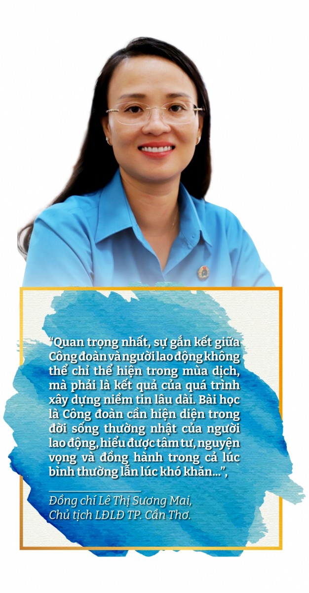 Đồng chí Lê Thị Sương Mai, Chủ tịch LĐLĐ TP. Cần Thơ, cho biết: Dịch bệnh là thời điểm người lao động bị tác động nặng nề nhất: mất việc, giảm thu nhập, lo lắng về sức khỏe và tương lai. Trong bối cảnh đó, sự đồng hành kịp thời của Công đoàn, từ hỗ trợ nhu yếu phẩm, tài chính, tổ chức “Siêu thị 0 đồng”, “ATM gạo”, “Túi an sinh công đoàn”… đã thể hiện vai trò là “người bạn đồng hành” thực sự. Bài học rút ra là: muốn gắn bó lâu dài, Công đoàn phải trở thành chỗ dựa thực chất, có mặt đúng lúc người lao động cần nhất.