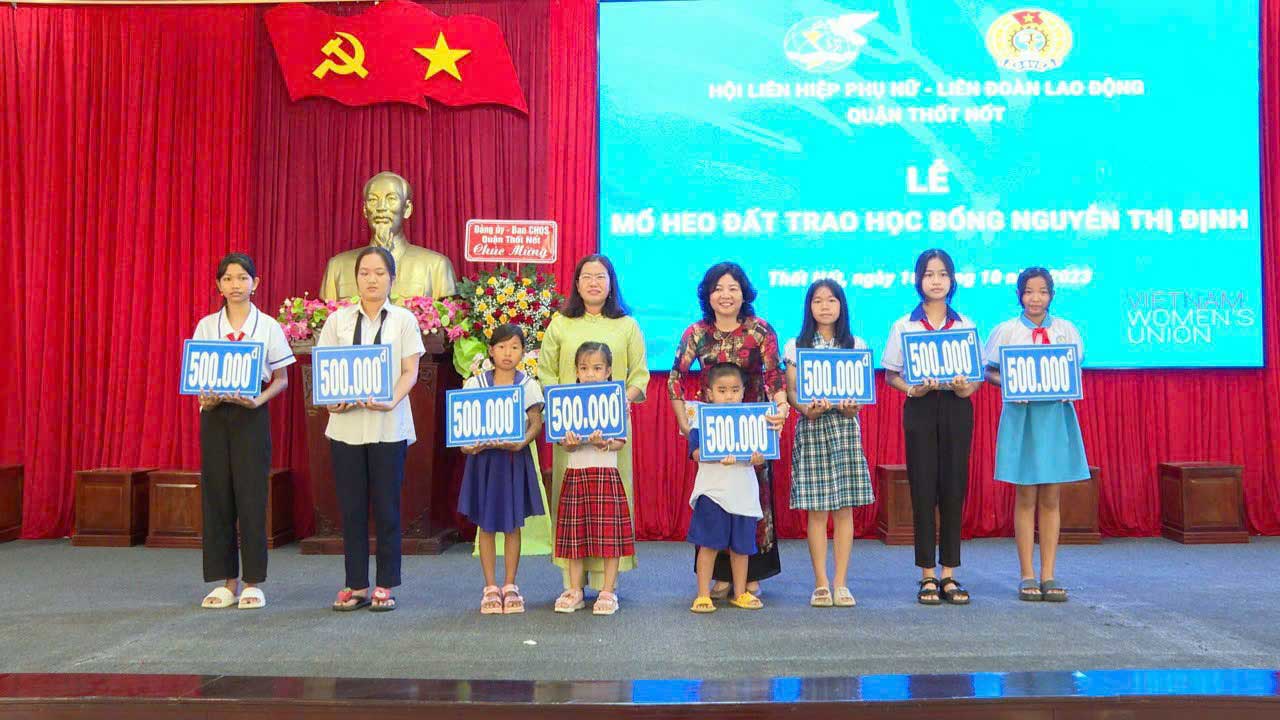 Nhân dịp này, LĐLĐ quận còn phối hợp với Hội Liên hiệp Phụ nữ quận trao học bổng Nguyễn Thị Định từ phong trào nuôi heo đất cho 45 em học sinh khó khăn, mỗi phần trị giá tiền mặt 500.000 đồng và 20 quyển tập, tổng trị giá quà vật 21,5 triệu đồng. Trong đó, LĐLĐ quận hỗ trợ 900 quyển tập, trị giá 9 triệu đồng.