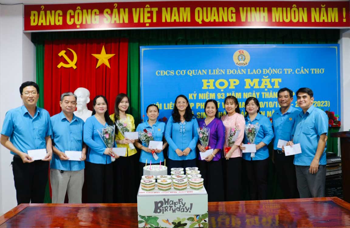 Chủ tịch LĐLĐ TP Cần Thơ Lê Thị Sương Mai tặng hoa và quà chúc mừng sinh nhật các đoàn viên. Ảnh: LĐLĐ TP Cần Thơ