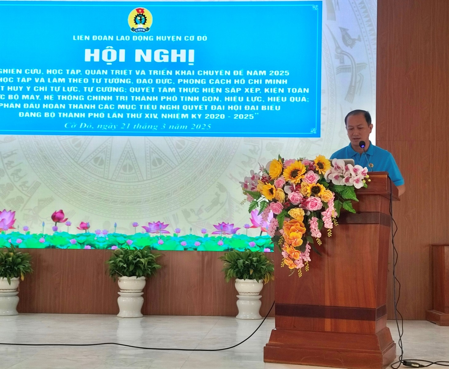 Ngày 21/3/2025, Liên đoàn Lao động huyện Cờ Đỏ tổ chức Hội nghị tuyên truyền, triển khai, quán triệt chuyên đề năm 2025 “Học tập và làm theo tư tưởng, đạo đức, phong cách Hồ Chí Minh về phát huy ý chí tự lực, tự cường; quyết tâm thực hiện sắp xếp, kiện toàn tổ chức bộ máy, hệ thống chính trị thành phố tinh gọn, hiệu lực, hiệu quả; phấn đấu hoàn thành các mục tiêu Nghị quyết Đại hội đại biểu Đảng bộ thành phố lần thứ XIV, nhiệm kỳ 2020 - 2025”.