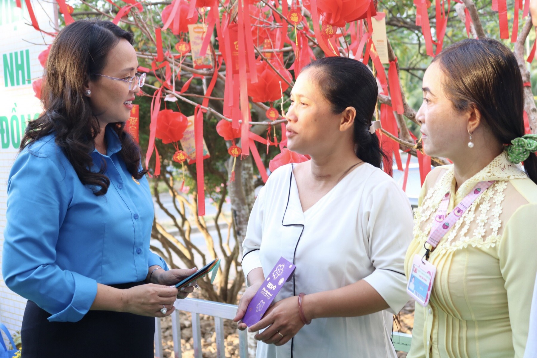 Bà Lê Thị Sương Mai - Chủ tịch LĐLĐ thành phố - thăm hỏi đoàn viên, người lao động.