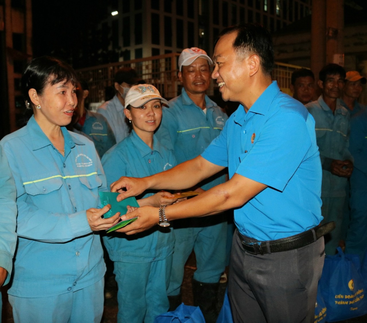 Đồng chí Nguyễn Ngọc Tấn - Phó Chủ tịch LĐLĐ TP tặng quà, chúc Tết và lì xì cho đoàn viên, người lao động