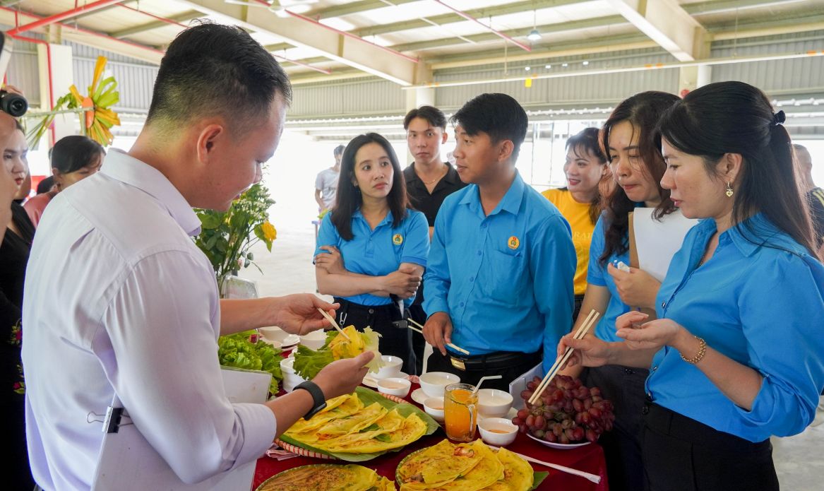 Đoàn viên, công nhân lao động thể hiện sự khéo léo với việc làm bánh xèo. Ảnh: Phương Anh