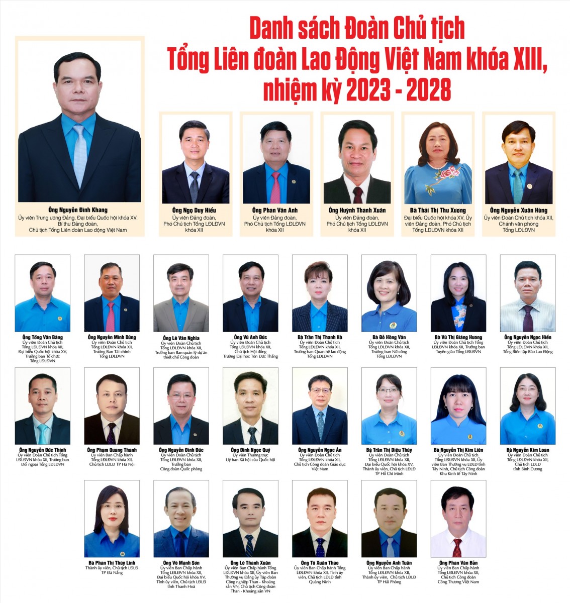 Báo Lao Động trân trọng giới thiệu danh sách và chúc mừng các Ủy viên Đoàn Chủ tịch Tổng LĐLĐVN khoá XIII, nhiệm kỳ 2023-2028.