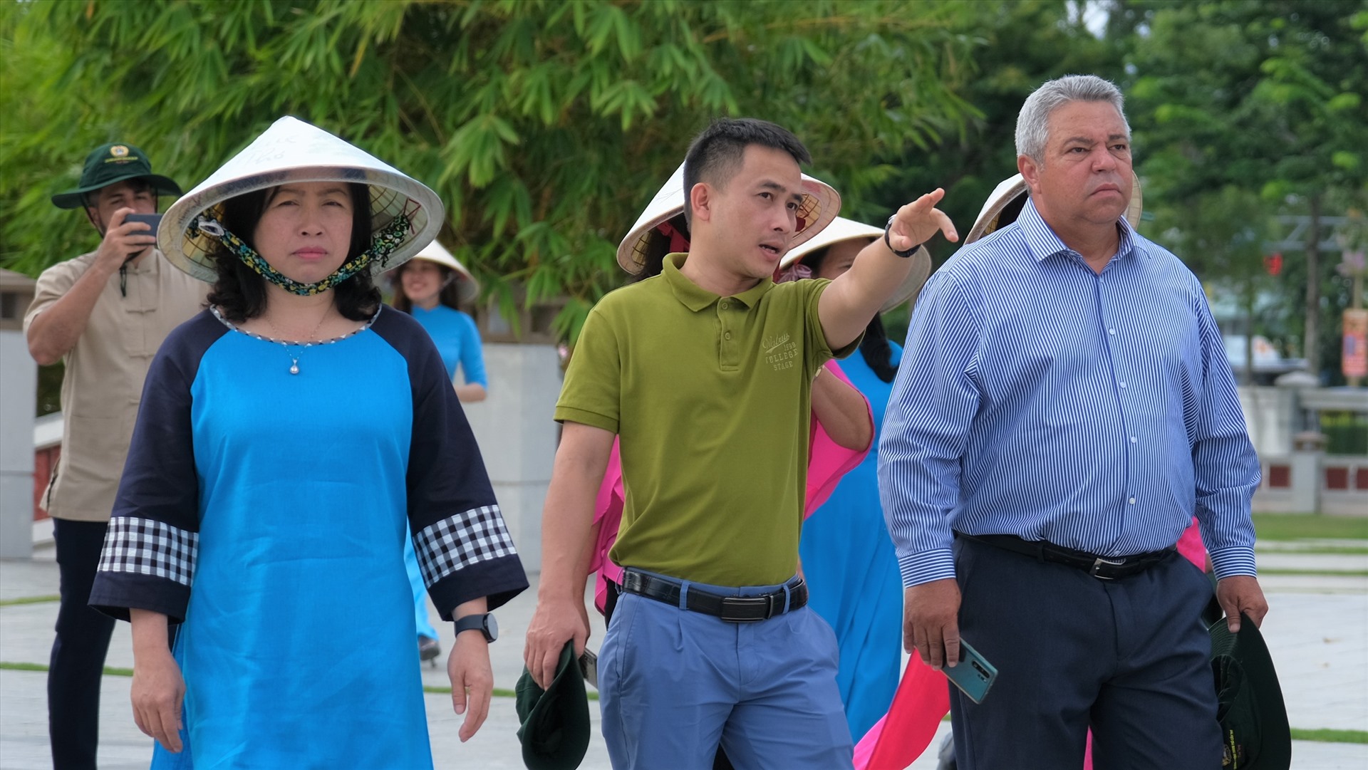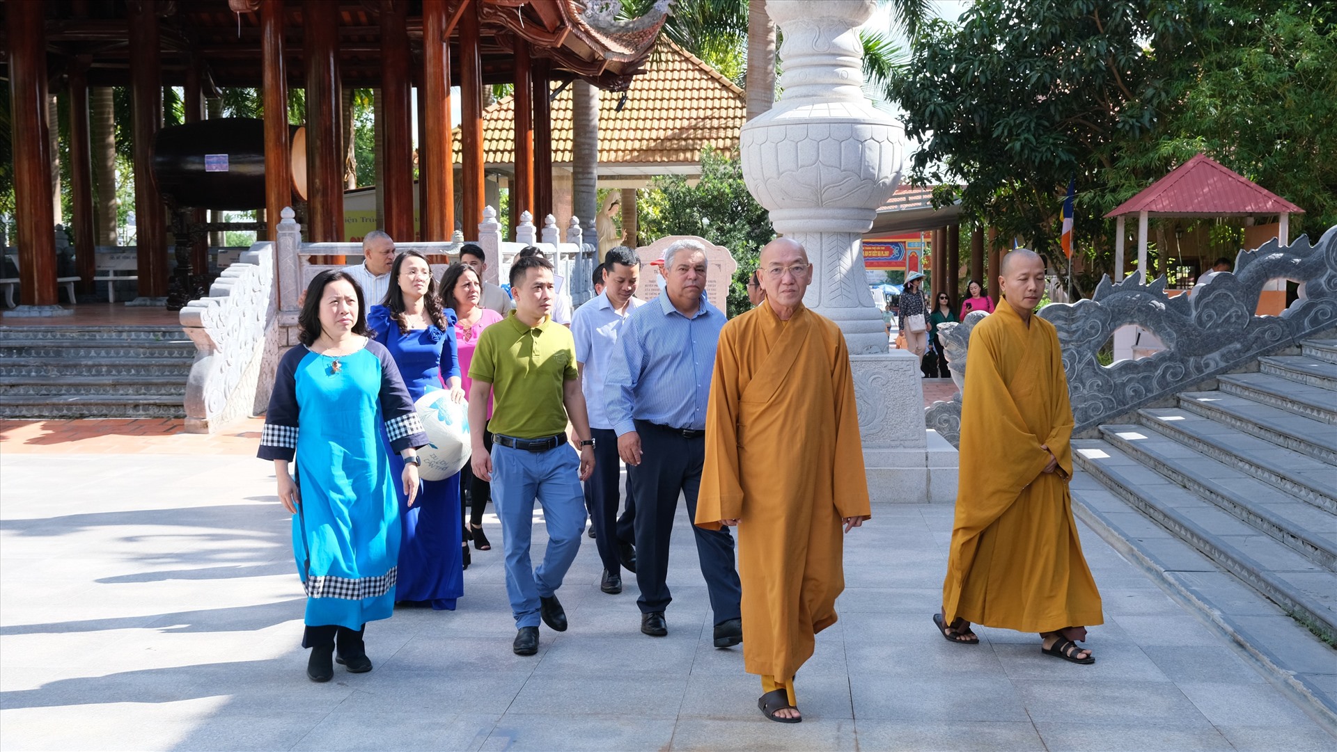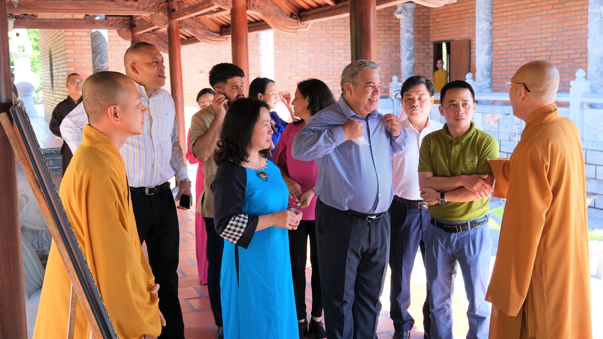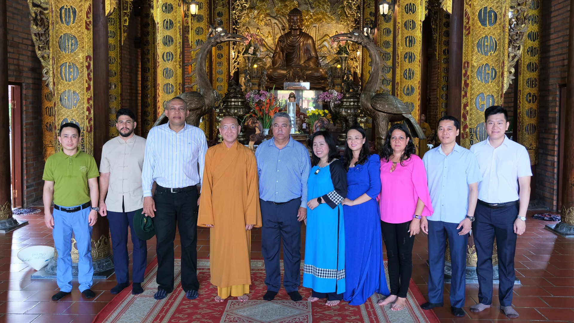 Ông Ulises Guilarte de Nacimiento cùng các thành viên trong đoàn chụp ảnh lưu niệm tại Thiền viện Trúc Lâm Phương Nam, Cần Thơ.