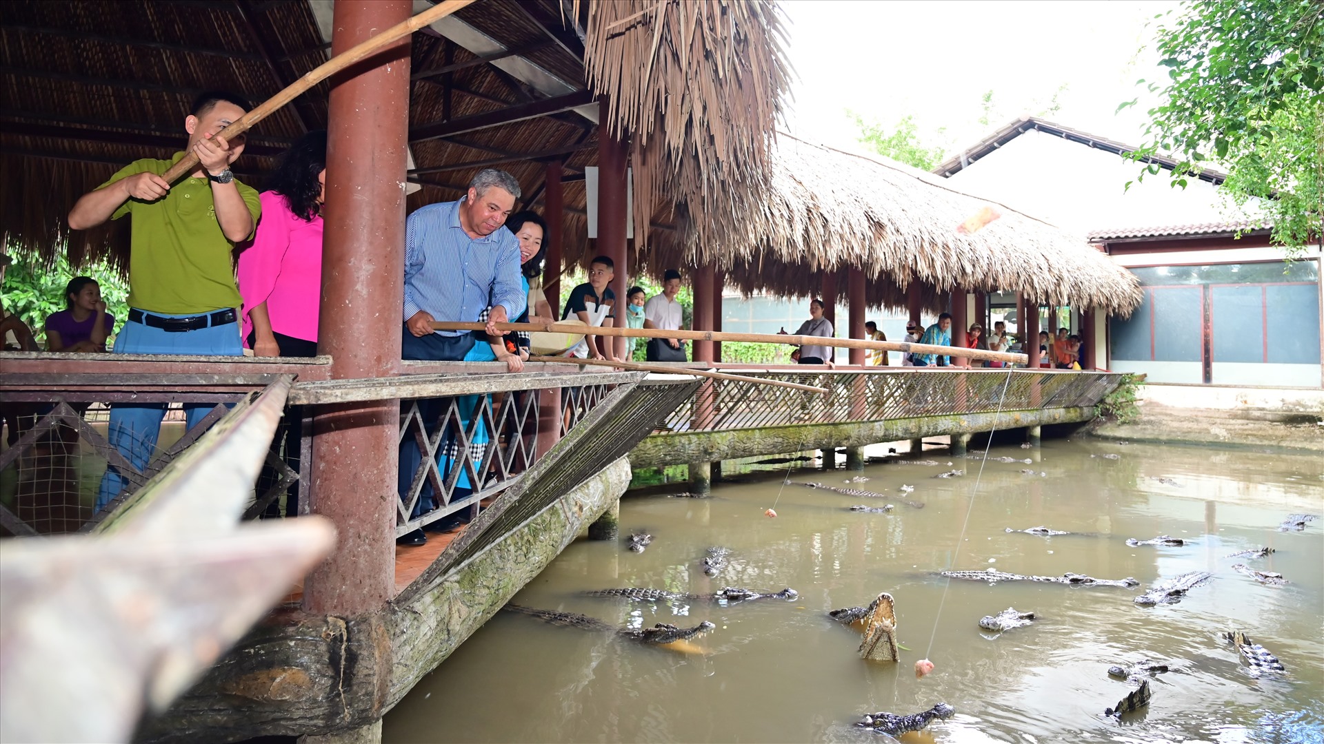 Đoàn công tác cũng có chuyến tham quan, tìm hiểu vườn cây ăn trái tại Làng du lịch Mỹ Khánh (huyện Phong Điền, TP Cần Thơ) và trải nghiệm các trò chơi đặc sắc của miền Tây. Trong ảnh, ông Ulises Guilarte de Nacimiento hứng thú với trò câu cá sấu.