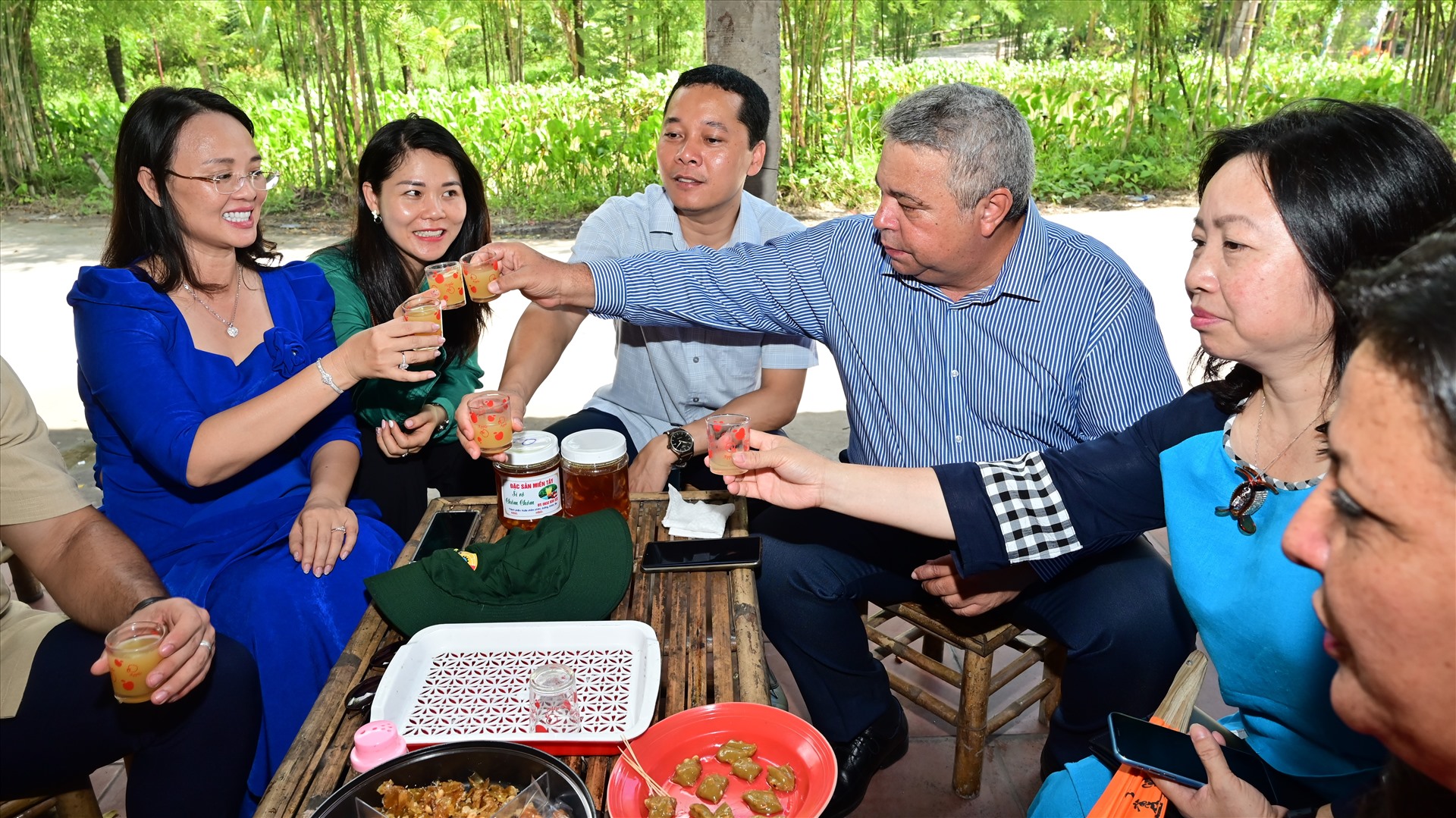 Đoàn đại biểu cấp cao Trung tâm Những Người lao động Cuba cũng rất ấn tượng khi thưởng thức thức uống đặc sản của đất Cần Thơ - nước chôm chôm, tìm hiểu về chế biến kẹo dừa sáp cũng như giao lưu văn hóa cùng người dân địa phương.