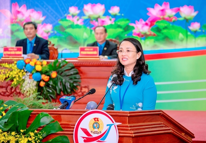 Chủ tịch Liên đoàn Lao động TP Cần Thơ Lê Thị Sương Mai phát biểu tại Đại hội. Ảnh: Lê Phú.