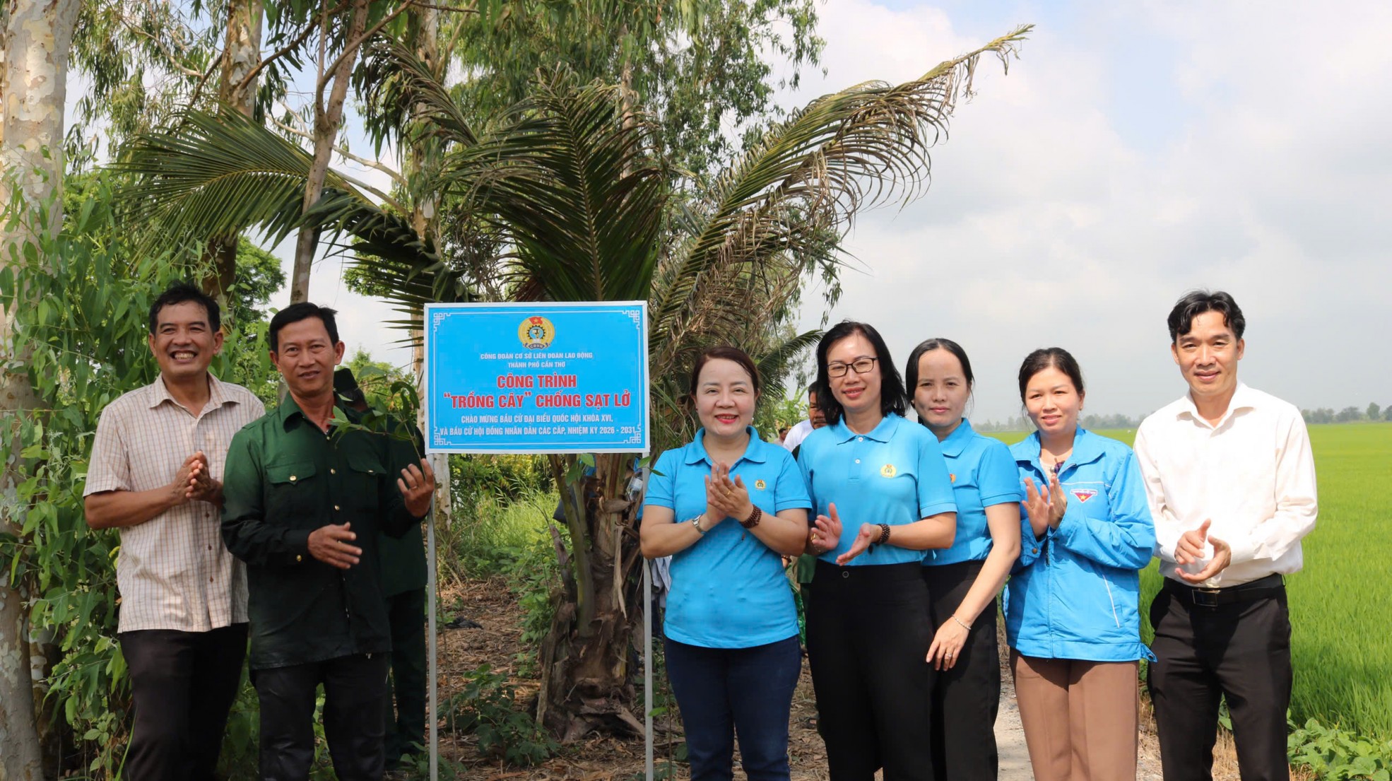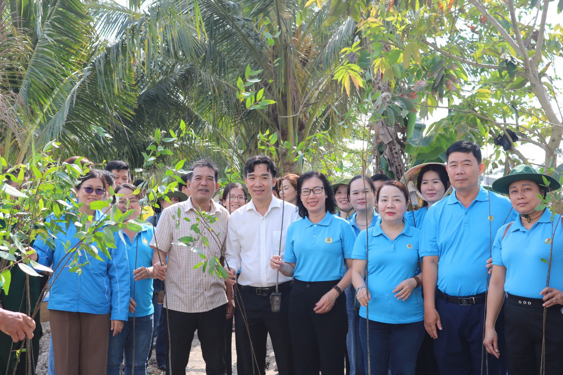 Công đoàn cơ sở Liên đoàn Lao động TP Cần Thơ phối hợp với UBND xã Vĩnh Trinh tổ chức trồng 1.000 cây bần chống sạt lở. Ảnh: LĐLĐ TP Cần Thơ