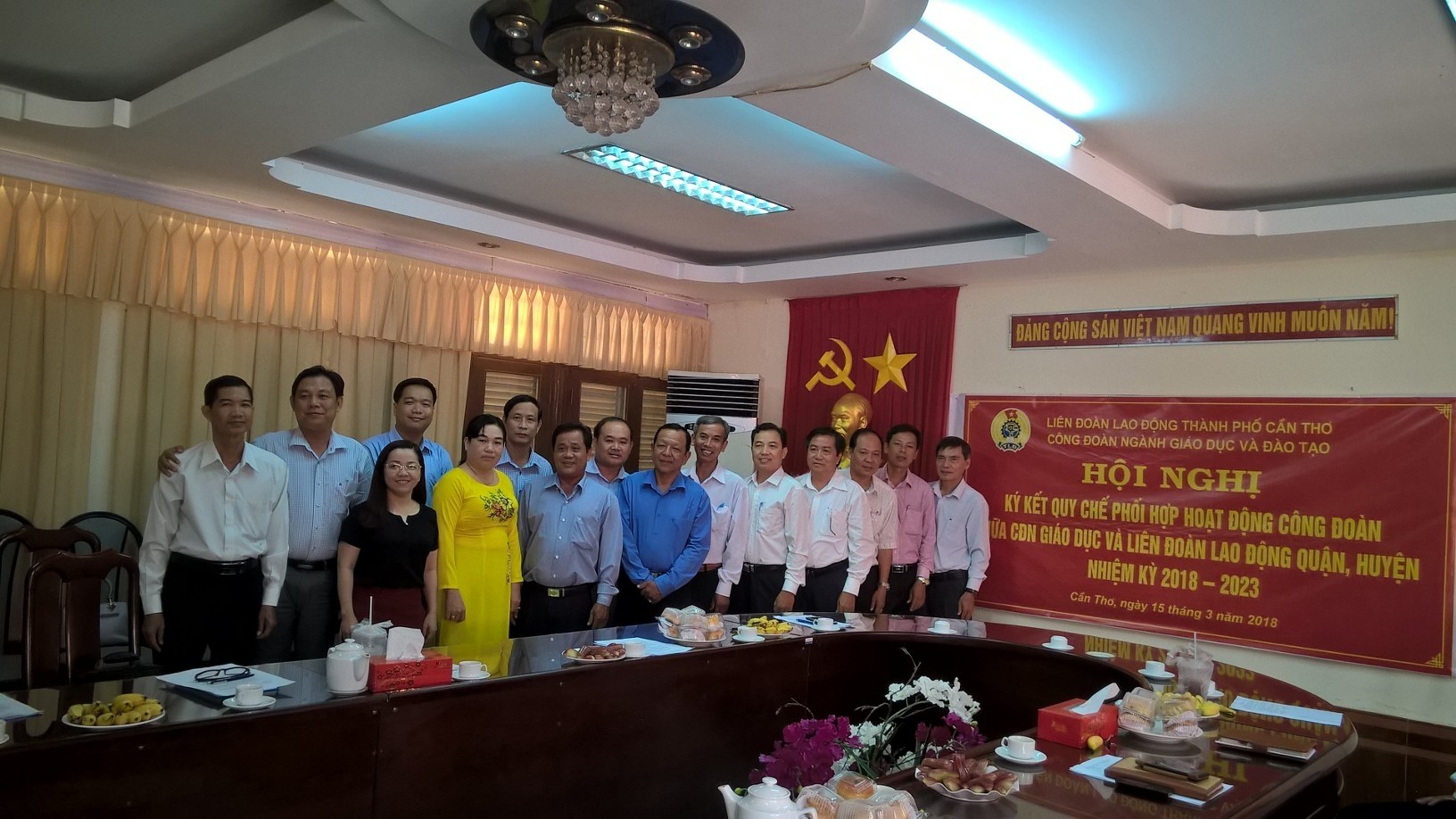 Hội nghị tiến hành kí kết Quy chế phối hợp giữa Công đoàn Ngành và 09 Liên đoàn Lao động quận/huyện nhiệm kỳ 2018 – 2023 trước sự chứng kiến của đại diện Liên đoàn Lao động thành phố và Lãnh đạo các Phòng GD&ĐT quận (huyện) và thống nhất tháng 9/2018 Hội nghị sơ kết sẽ được tiến hành tại huyện Vĩnh Thạnh và do Liên đoàn Lao động huyện Vĩnh Thạnh đăng cai tổ chức.