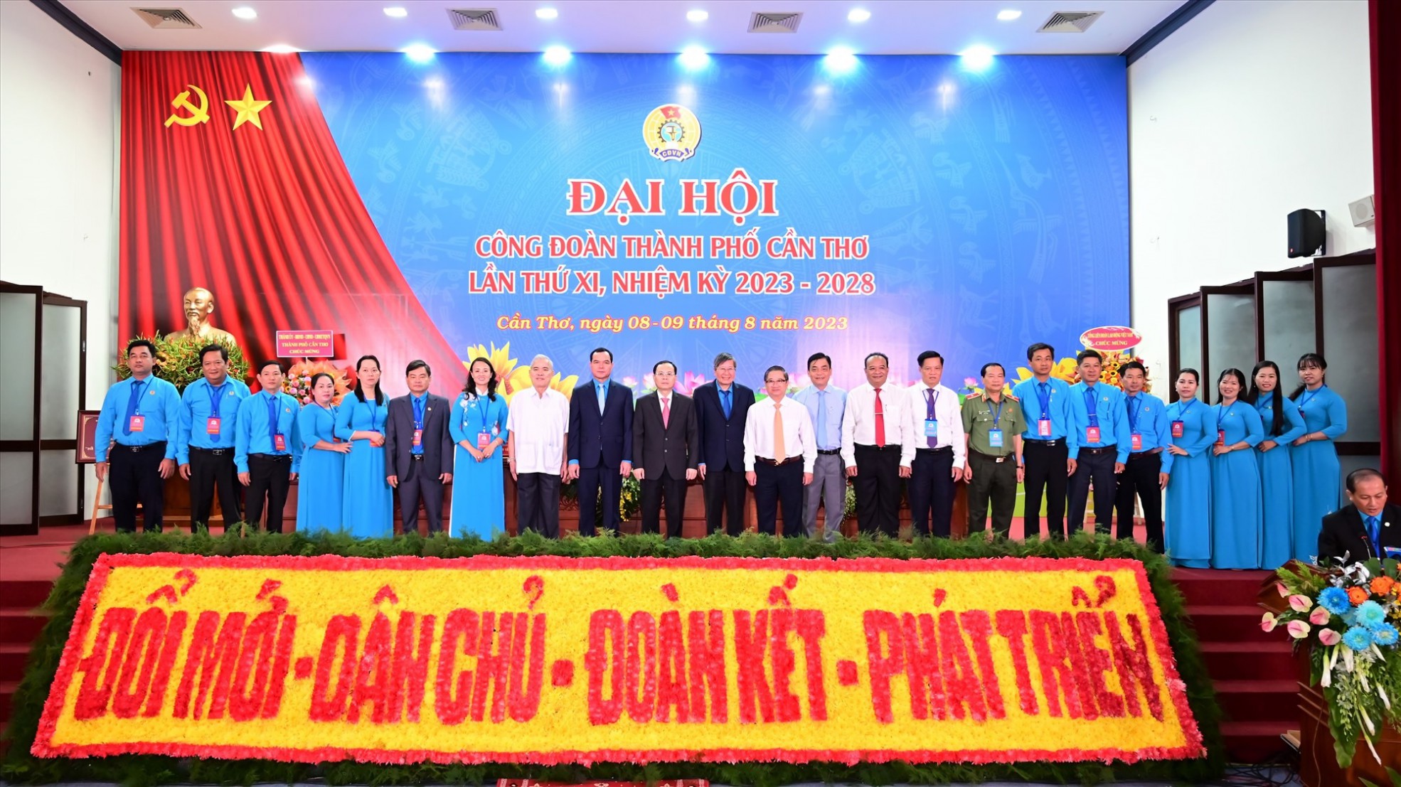 Lãnh đạo Tổng LĐLĐVN, lãnh đạo TP Cần Thơ chụp ảnh lưu niệm với các đoàn đại biểu tham dự Đại hội. Ảnh: Đạt Phan