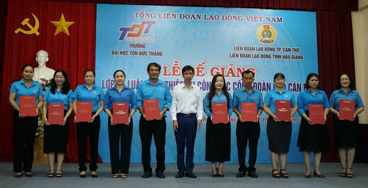 Thực hiện Quyết định số 904/QĐ-TLĐ ngày 29/07/2011 của Tổng LĐLĐ Việt Nam về phê chuẩn và cho triển khai Chương trình đào tạo “Lý luận và Nghiệp vụ công tác Công đoàn”, Trường Đại học Tôn Đức Thắng đã phối hợp với LĐLĐ TP Cần Thơ tổ chức đào tạo lớp Lý luận và Nghiệp vụ công tác Công đoàn - khóa 40 cho 50 cán bộ công đoàn của LĐLĐ TP Cần Thơ và LĐLĐ tỉnh Hậu Giang từ ngày 20.8.2022 đến ngày 22.4.2023.