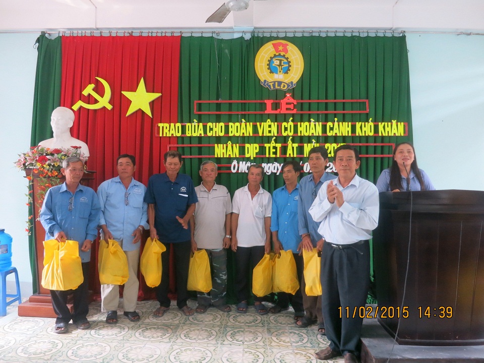 Nhằm chăm lo cho đoàn viên có hoàn cảnh khó khăn được vui Xuân đón Tết. Ngày 11/02/2015 Ban Thường vụ Liên đoàn Lao động quận Ô Môn tổ chức trao quà tết cho 80 đoàn viên Nghiệp đoàn xe số 01, số 8 Phường Châu Văn Liêm và số 4 Phường Thới Long với tổng số tiền là 8.000.000 đồng.