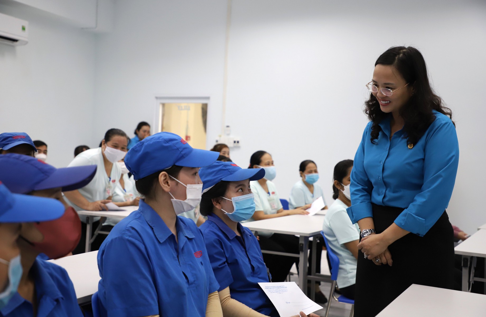 Đ/c Lê Thị Sương Mai - Thành ủy viên, Chủ tịch LĐLĐ TPCT tặng quà cho đoàn viên, người lao động công ty CP Xuất nhập khẩu Thủy sản Cần Thơ (Caseamex)
