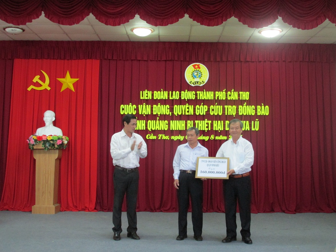 Thực hiện sự chỉ đạo của Thành ủy Cần Thơ, UBMTTQ Việt Nam thành phố, lời kêu gọi của Chủ tịch TLĐ ủng hộ kinh phí để xây mới, sửa sang lại nhà cửa cho công nhân vùng lũ tỉnh Quảng Ninh và nhiều tỉnh miền núi phía bắc bị ảnh hưởng do mưa lũ. Chiều ngày 5/8/2015. Liên đoàn Lao động thành phố Cần Thơ tổ chức cuộc vận động quyên góp cứu trợ đồng bào tỉnh Quảng Ninh bị thiệt hại do mưa lũ.