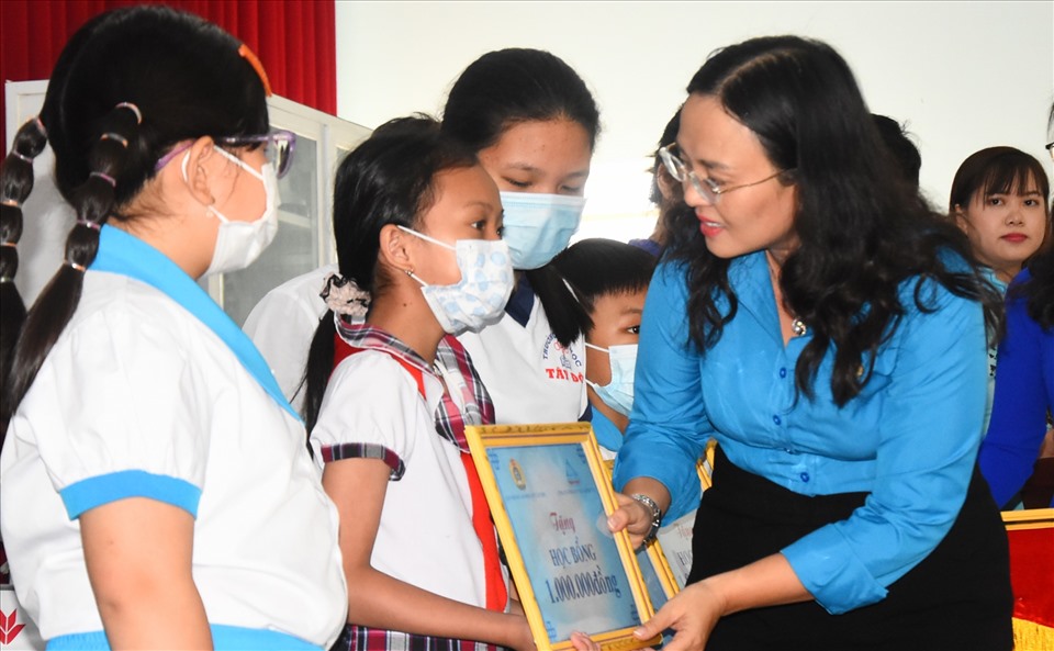 Chủ tịch LĐLĐ TP.Cần Thơ Lê Thị Sương Mai trao quà cho các em học sinh. Ảnh: Th.N