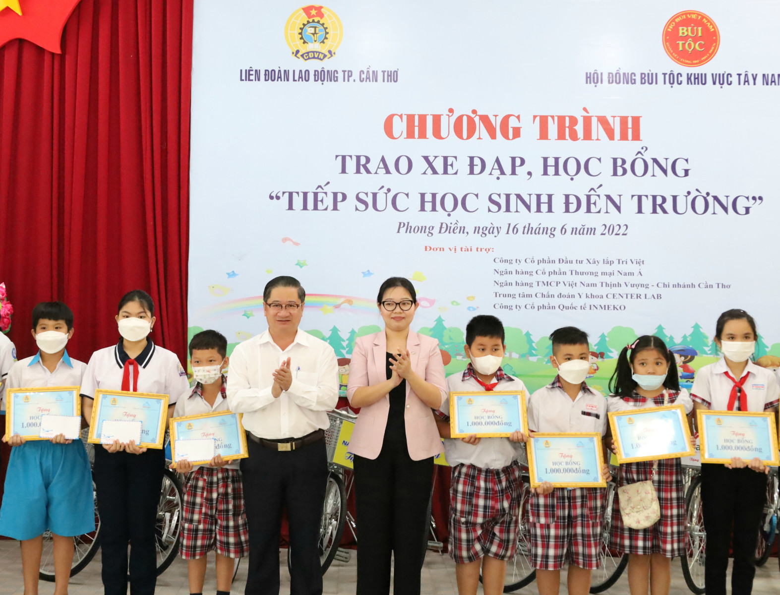 Liên đoàn Lao động thành phố được sự đồng hành của lãnh đạo Hội đồng Bùi tộc Tây Nam bộ trong việc kêu gọi Công ty cổ phần Đầu tư xây lắp Trí Việt, Ngân hàng Cổ phần Thương mại Nam Á; Trung tâm chẩn đoán y khoa CENTER LAB; Ngân hàng TMCP Việt Nam Thịnh Vượng chi nhánh Cần Thơ; Công ty Cổ phần Quốc tế INMEKO; Ông Nguyễn Hiếu Học - Chủ tịch HĐQT kiêm TGĐ Cty CP Thiên Quân trao tặng cho các em học sinh nghèo, có hoàn cảnh đặc biệt khó khăn trên địa bàn TP. Cần Thơ, với tổng trị giá 161 triệu đồng.
