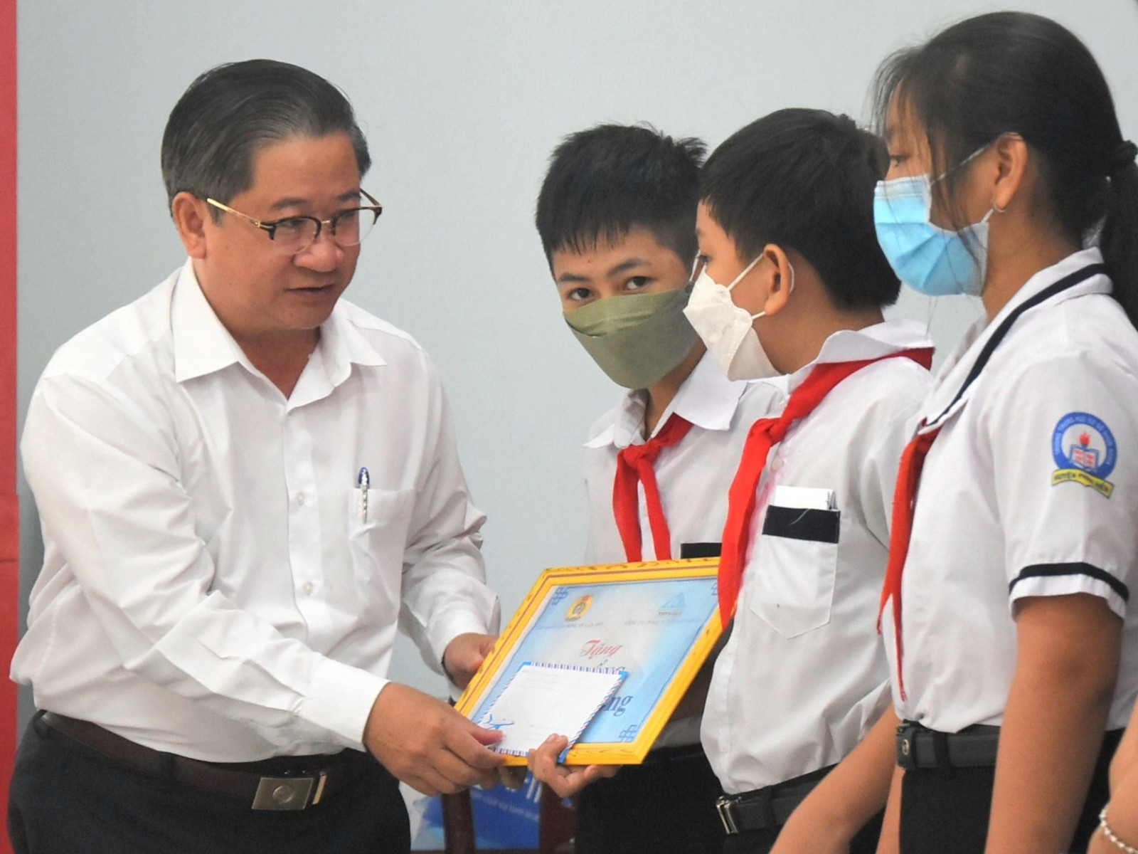 Chủ tịch UBND TP.Cần Thơ Trần Việt Trường trao quà cho các em học sinh. Ảnh: Th.N