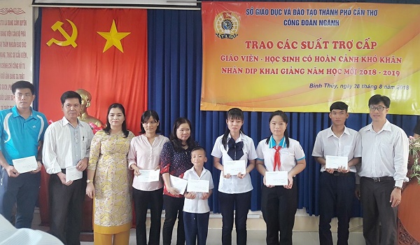 Ngày 28/8/2018 Công đoàn Ngành phối hợp cùng Sở GD&ĐT TP. Cần Thơ tổ chức 02 đoàn đến các đơn vị trực thuộc trao các suất trợ cấp đến giáo viên và học sinh có hoàn cảnh khó khăn dịp khai giảng năm học mới 2018 - 2019, số tiền trợ cấp được trích từ nguồn vận động hỗ trợ giáo viên, học sinh của NGNLĐ ngành GD&ĐT TP Cần Thơ năm học 2017 – 2018.
