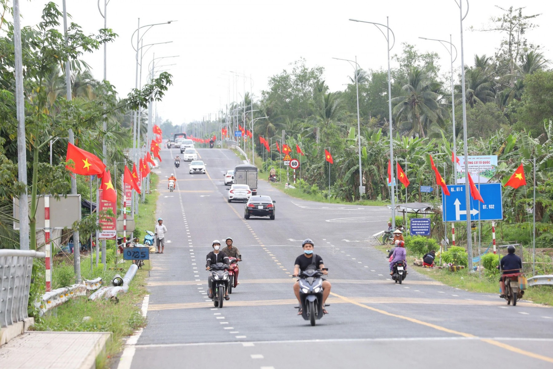 Đường cờ Tổ quốc nằm trên tỉnh lộ 926 tạo vẻ mỹ quan cho xã Nhơn Ái và nâng cao lòng yêu nước cho người dân nơi đây