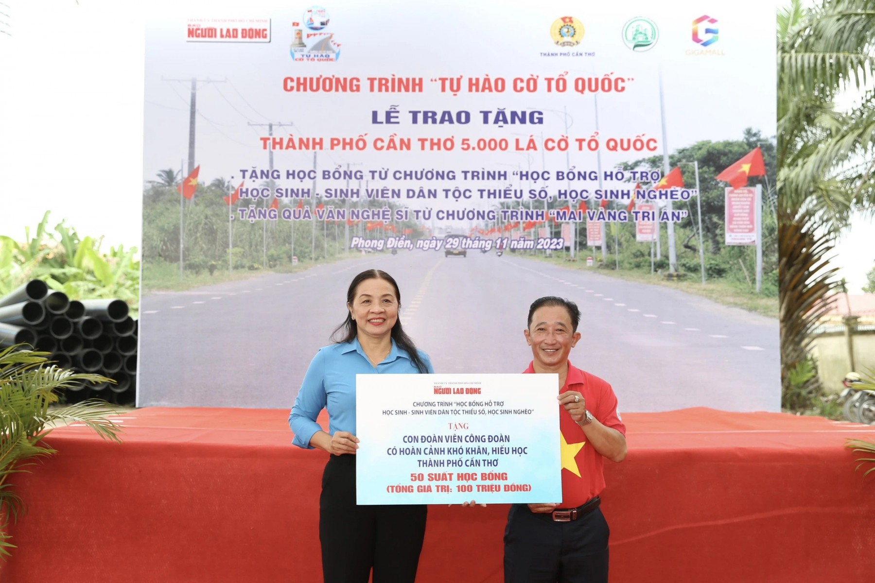 Ông Bùi Thanh Liêm, Phó Tổng Biên tập Báo Người Lao Động, trao bảng tượng trưng tặng 5.000 lá cờ và 50 suất học bổng, cho bà Huỳnh Thị Hiền, Phó Chủ tịch Thường trực Liên đoàn Lao động TP Cần Thơ
