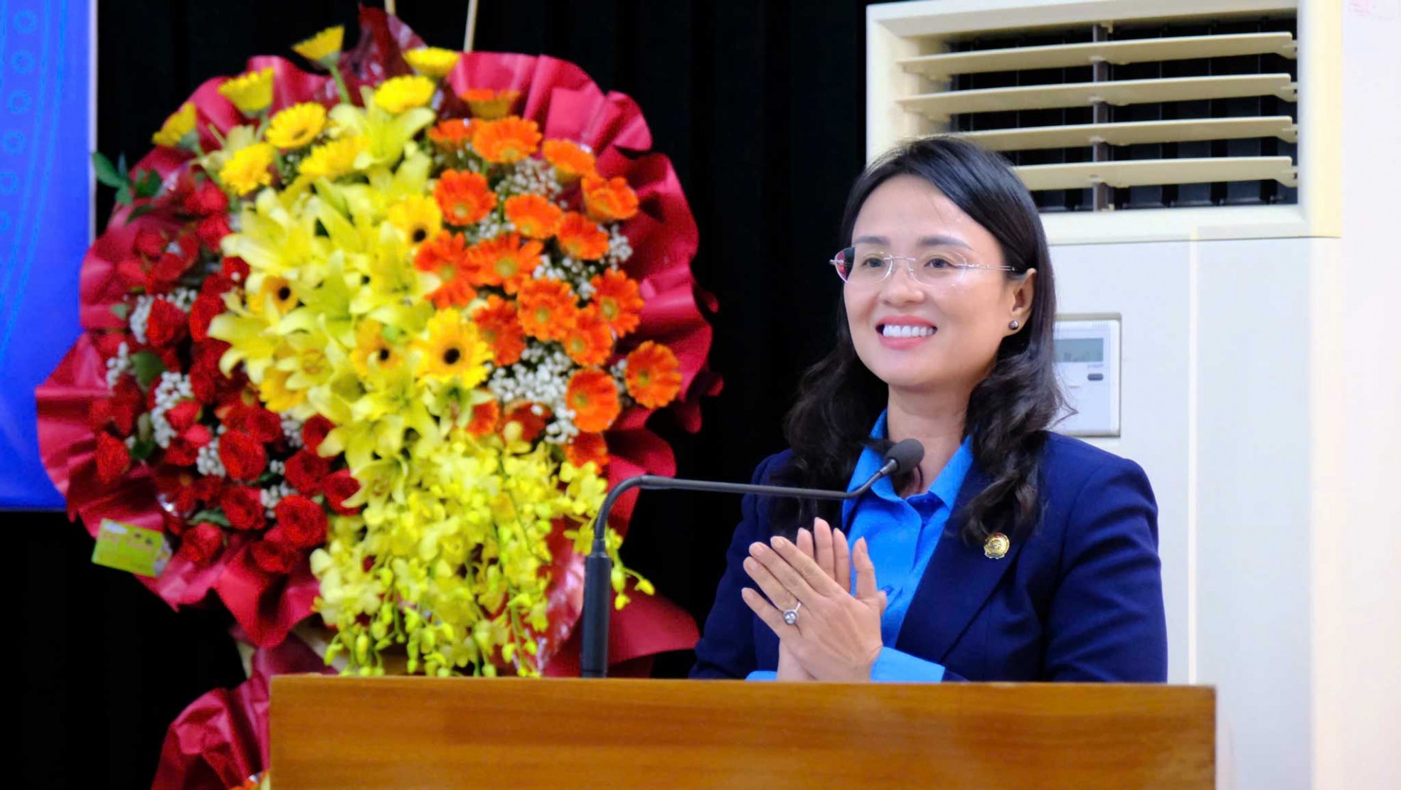 Bà Lê Thị Sương Mai - Ủy viên BCH Tổng LĐLĐ Việt Nam, Thành ủy viên, Phó Chủ tịch Ủy ban MTTQ Việt Nam thành phố, Chủ tịch LĐLĐ TP Cần Thơ phát biểu tại đại hội. Ảnh: Mỹ Ly