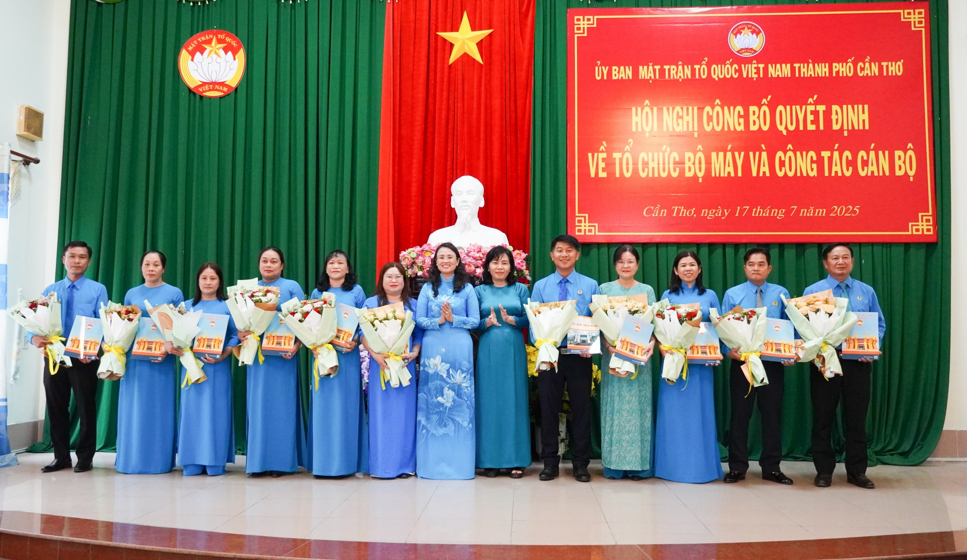 Chiều 17.7, Ban Thường trực Ủy ban Mặt trận Tổ quốc (MTTQ) Việt Nam TP Cần Thơ tổ chức Hội nghị công bố các quyết định về tổ chức bộ máy và công tác cán bộ của Cơ quan Ủy ban MTTQ Việt Nam TP.