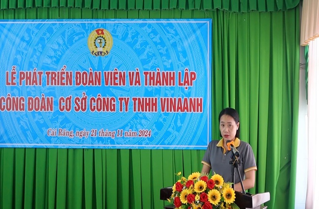 Thay mặt Ban chấp hành CĐCS, đồng chí Châu Thị Thu Trang - Chủ tịch CĐCS Công ty TNHH VINAANH cảm ơn và tiếp thu những ý kiến phát biểu chỉ đạo của Liên đoàn Lao động quận Cái Răng. Trong thời gian tới Ban chấp hành CĐCS Công ty TNHH VINAANH sẽ cùng với chủ cơ sở xây dựng các nội quy, quy chế về tiêu chuẩn an toàn vệ sinh lao động, chính sách Bảo hộ lao động, quan tâm đến điều kiện làm việc, không để xảy ra tai nạn lao động, bảo vệ môi trường và vệ sinh lao động. Phối hợp với chủ cơ sở hoàn thành đạt và vượt kế hoạch kinh doanh hàng năm. Chăm lo lợi ích vật chất tinh thần cho người lao động, vận động đoàn viên công đoàn tích cực tham gia các hoạt động xã hội, thăm hỏi giúp đỡ nhau khi gặp khó khăn, phòng chống các tệ nạn xã hội trong công nhân lao động. Do vừa mới thành lập nên chắc chắn sẽ còn nhiều bở ngỡ trong các hoạt động; Ban chấp hành CĐCS rất mong được sự hỗ trợ của Liên đoàn Lao động quận Cái Răng, Ban Giám đốc Công ty TNHH VINAANH và đặc biệt là sự hưởng ứng nhiệt tình của đoàn viên công đoàn trong các phong trào thi đua do tổ chức Công đoàn cấp trên phát động.