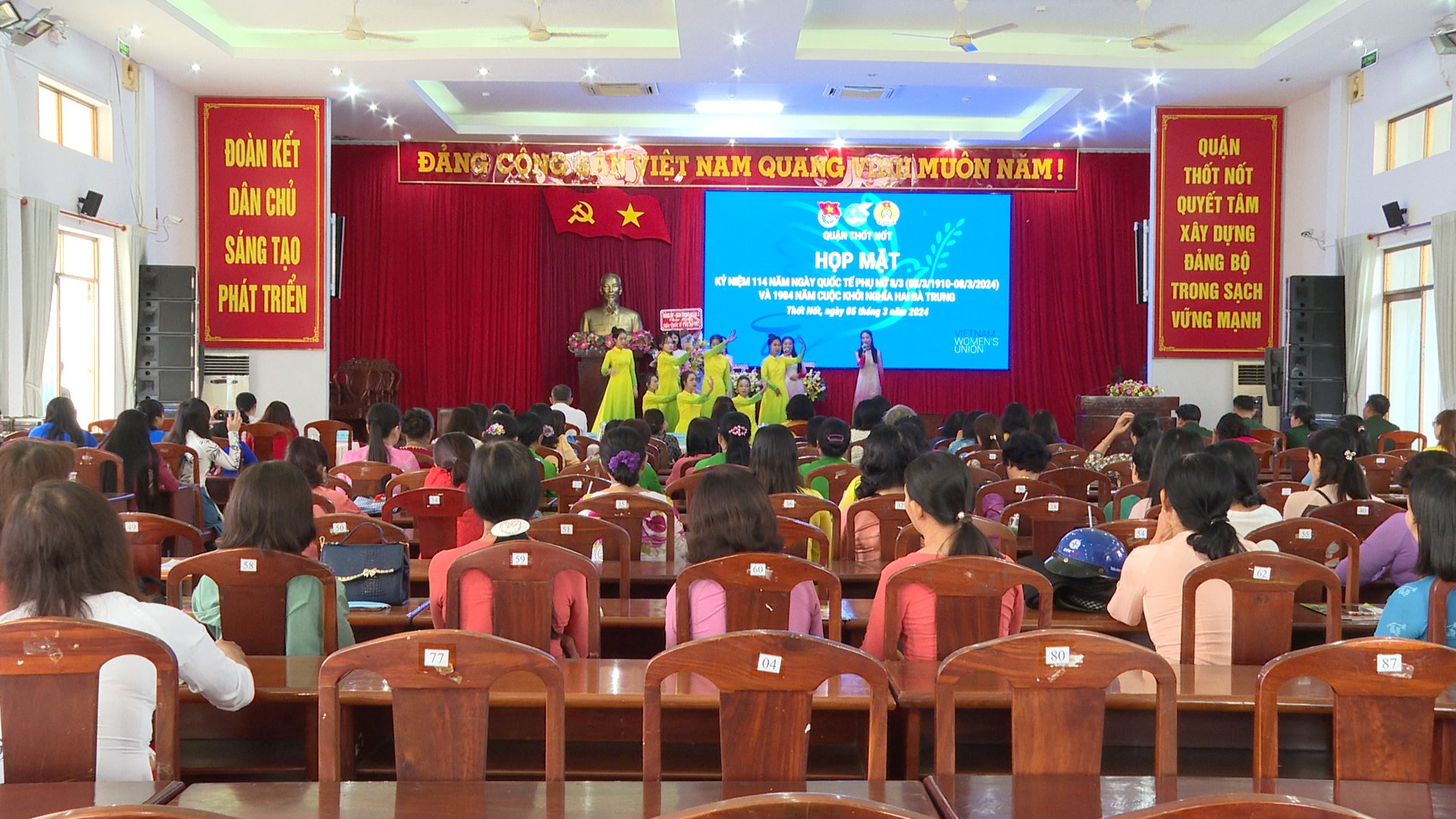 Tại buổi họp mặt, các đại biểu đã được xem và thưởng thức các tiết mục văn nghệ ca ngợi Đảng, tình yêu quê hương, đất nước, ca ngợi người phụ nữ Việt Nam; cùng nhau ôn lại truyền thống Ngày Quốc tế phụ nữ 8/3 và 1984 năm cuộc khởi nghĩa Hai Bà Trưng. Lãnh đạo quận Thốt Nốt ghi nhận và biểu dương những đóng góp của các chị em phụ nữ trên địa bàn quận trong các phong trào thi đua yêu nước, góp phần cùng các ngành, các cấp hoàn thành thắng lợi các nhiệm vụ phát triển kinh tế - xã hội ở địa phương.