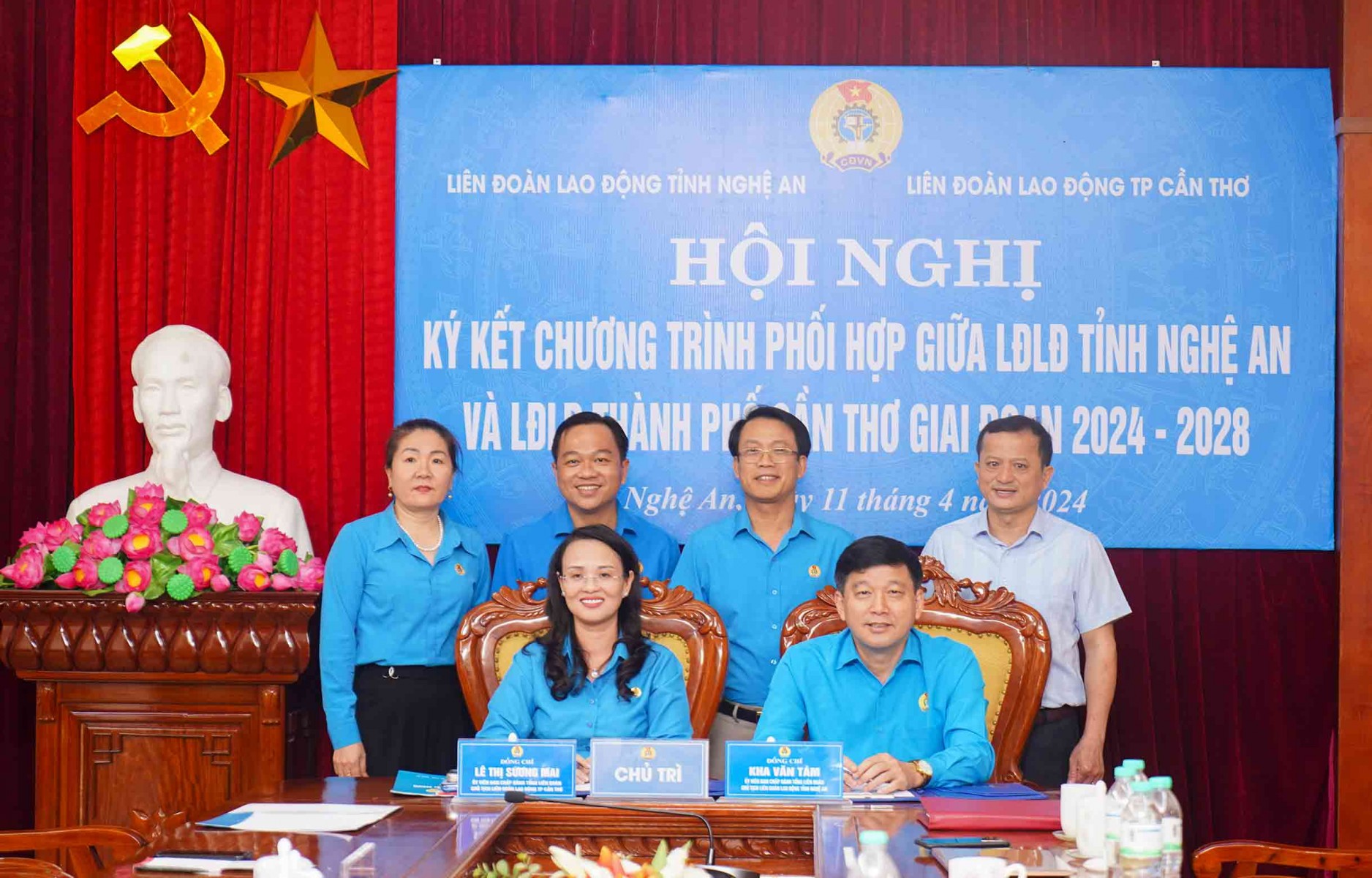 Ban Thường vụ Liên đoàn Lao động thành phố Cần Thơ và Ban Thường vụ Liên đoàn Lao động tỉnh Nghệ An thống nhất tổ chức ký kết một số nội dung phối hợp giai đoạn 2024 - 2028, gồm: Trao đổi, thông tin lẫn nhau giữa Liên đoàn Lao động thành phố Cần Thơ và Liên đoàn Lao động tỉnh Nghệ An và Công đoàn cấp trên trực tiếp của 2 địa phương về tình hình người lao động Nghệ An tham gia lao động, sinh sống tại Cần Thơ và ngược lại.