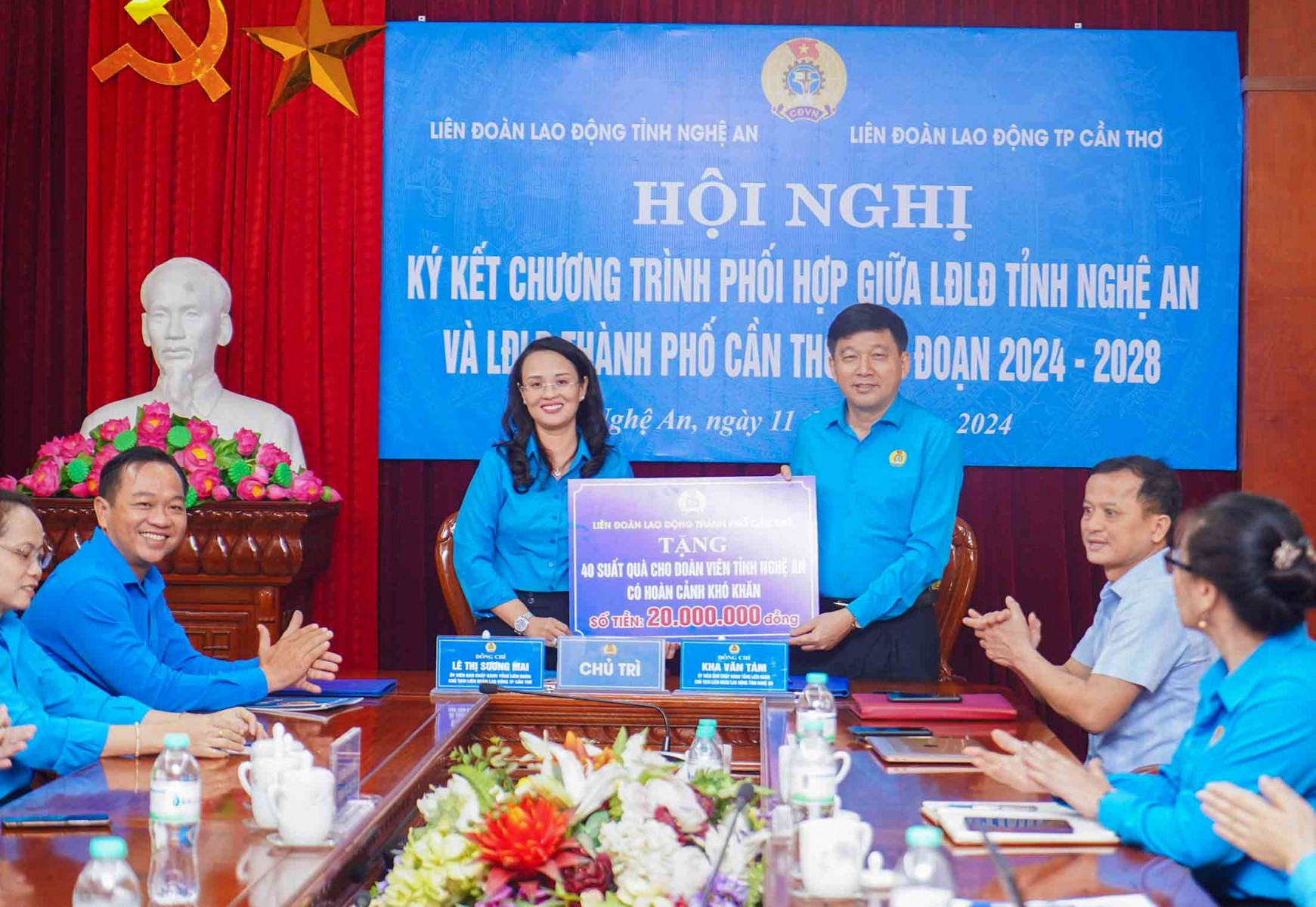 Nhân dịp kỷ niệm ngày sinh nhật Bác Hồ, hướng tới Tháng Công nhân năm 2024, kỷ niệm 95 năm Ngày thành lập Công đoàn Việt Nam, Liên đoàn Lao động thành phố Cần Thơ trao tặng 40 suất quà cho đoàn viên có hoàn cảnh khó khăn tỉnh Nghệ An với số tiền 20.000.000 đồng.