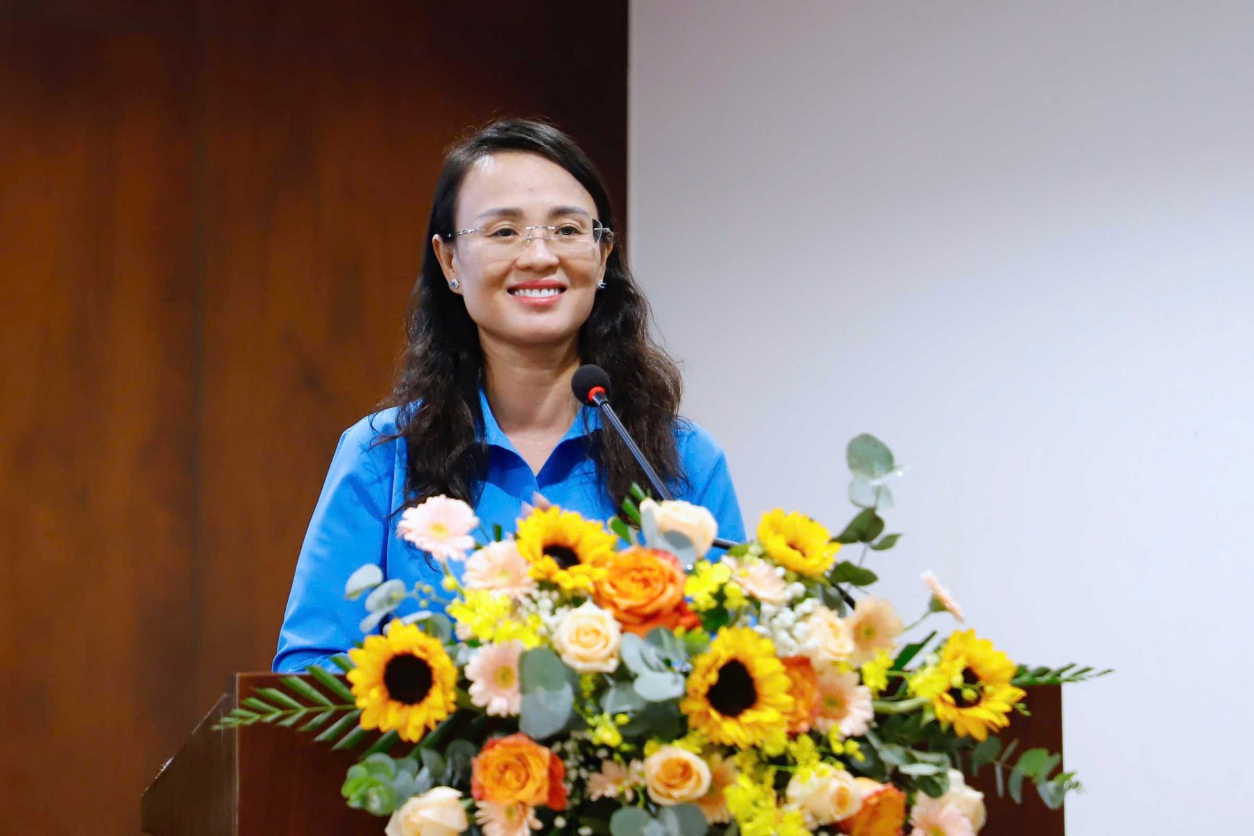Bà Lê Thị Sương Mai - Ủy viên Ban Chấp hành Tổng LĐLĐ Việt Nam, Thành ủy viên, Phó Chủ tịch Ủy ban MTTQ Việt Nam thành phố, Chủ tịch LĐLĐ TP Cần Thơ - phát biểu. Ảnh: Mỹ Ly