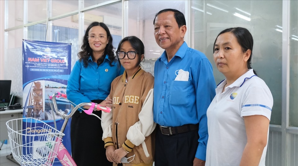 Cũng tại Công ty TNHH Một thành viên Ấn Độ Dương, Liên đoàn Lao động thành phố Cần Thơ đã trao cho em Phạm Thị Ngọc Châu (con của công nhân Nguyễn Thị Huyền Trân, An Giang) chiếc xe đạp để em thuận tiện trong việc đến trường. Được biết, chồng chị Huyền Trân mất sớm, chị phải làm việc xa nhà để kiếm tiền nuôi cha mẹ già và con gái đang học. Do từng bị tai nạn, nên hiện tại mức lương 6 triệu/tháng không đủ để trang trải cho các thành viên.