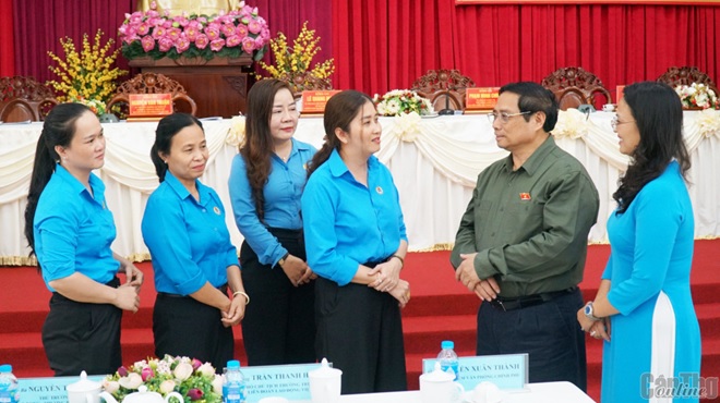 Thủ tướng Phạm Minh Chính thăm hỏi cán bộ Công đoàn TP Cần Thơ. Ảnh: ANH DŨNG