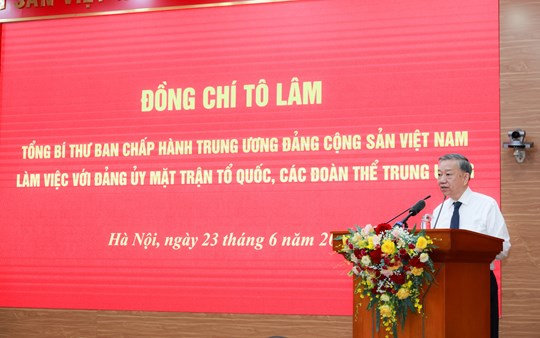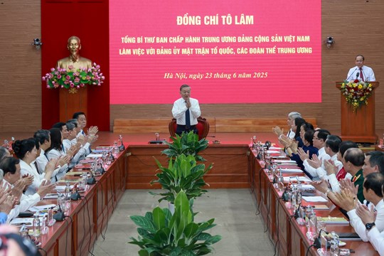 (Mặt trận) - Sáng ngày 23/6, tại Hà Nội, Tổng Bí thư Tô Lâm đã đến dự làm việc và trao Quyết định của Bộ Chính trị về việc thành lập Cơ quan Ủy ban Trung ương Mặt trận Tổ quốc Việt Nam. Đây là sự kiện có ý nghĩa đặc biệt quan trọng, đánh dấu bước phát triển mới trong công tác tổ chức, kiện toàn bộ máy, nâng cao hiệu lực hoạt động của MTTQ Việt Nam theo tinh thần chỉ đạo của Ban Chấp hành Trung ương, Bộ Chính trị, Ban Bí thư và đồng chí Tổng Bí thư về xây dựng bộ máy tinh gọn, hoạt động hiệu lực, hiệu quả, phục vụ nhân dân tốt hơn, đáp ứng yêu cầu phát triển đất nước trong kỷ nguyên vươn mình của dân tộc.