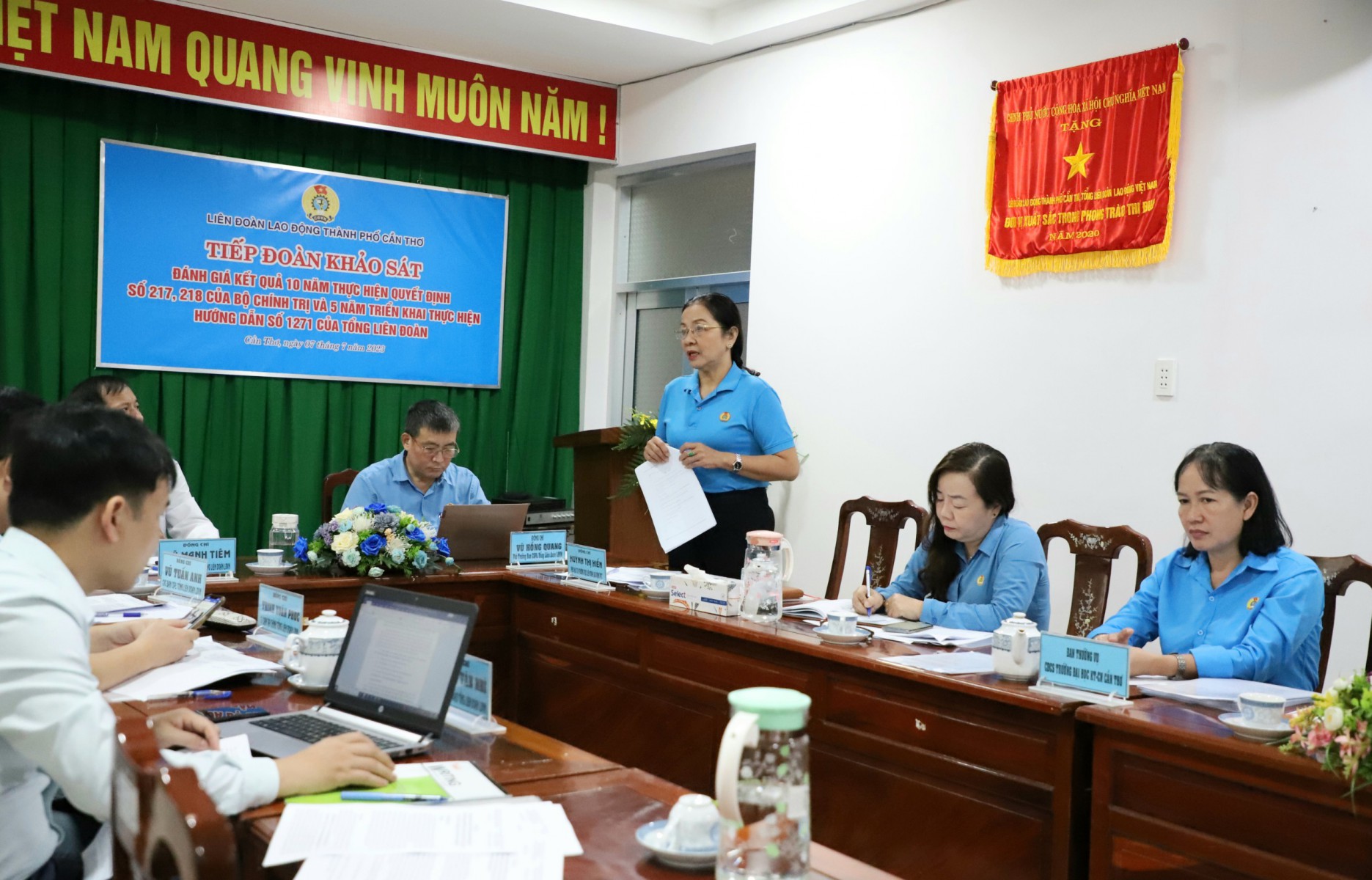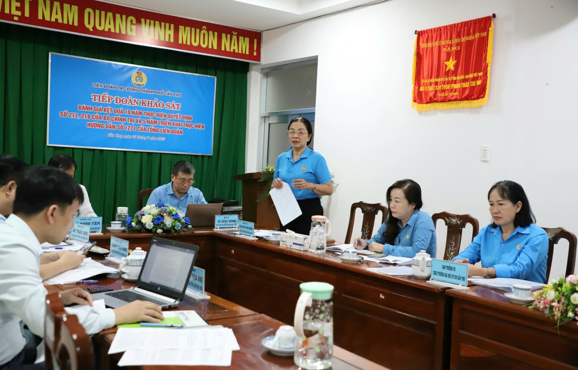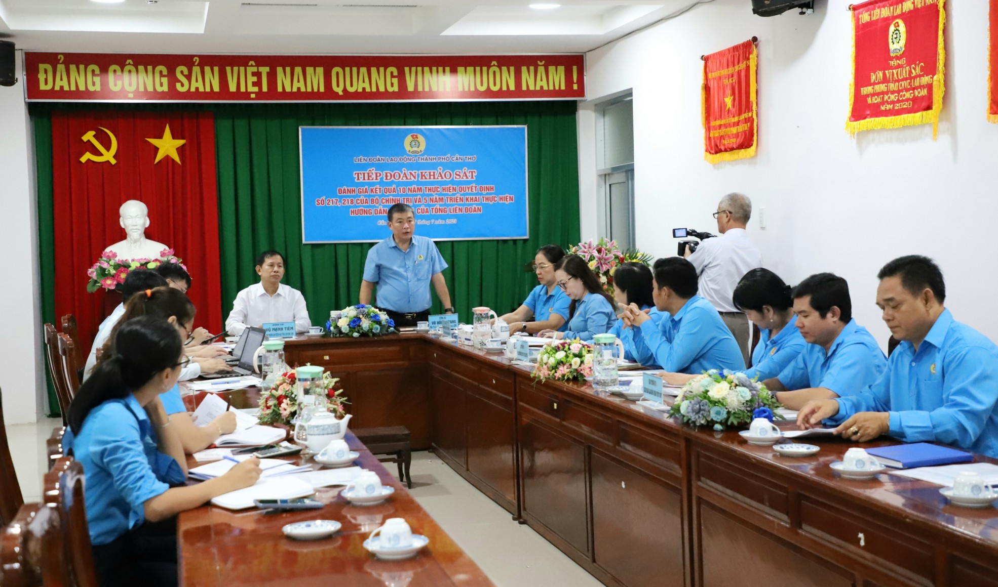 Ngày 7.7 Đoàn công tác Tổng LĐLĐ Việt Nam đã có buổi làm việc với lãnh đạo LĐLĐ TP Cần Thơ để khảo sát tình hình triển khai, thực hiện Quyết định số 218-QĐ/TW của Bộ Chính trị (khóa XI) về ban hành Quy định tham gia góp ý xây dựng Đảng, xây dựng chính quyền của MTTQVN và các đoàn thể chính trị - xã hội và nhân dân (Quyết định 218);
