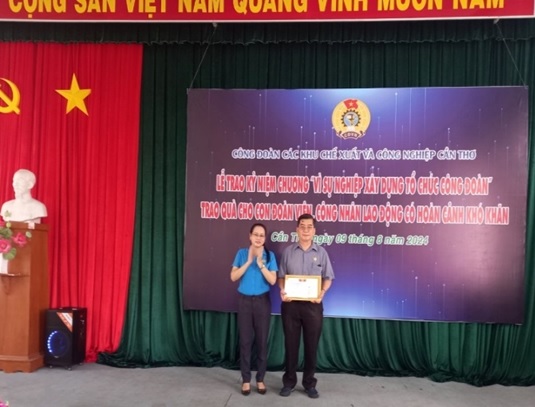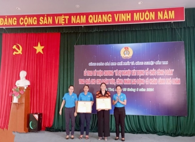 Ngày 09/8/2024, Công đoàn các Khu Chế xuất và Công nghiệp Cần Thơ tổ chức Lễ trao Kỷ niệm chương “Vì sự nghiệp xây dựng tổ chức Công đoàn”, trao Bằng khen cho đoàn viên tiêu biểu và trao quà cho con đoàn viên có hoàn cảnh khó khăn nhân kỷ niệm 95 năm ngày thành lập Công đoàn Việt Nam (28/7/1929 - 28/7/2024).